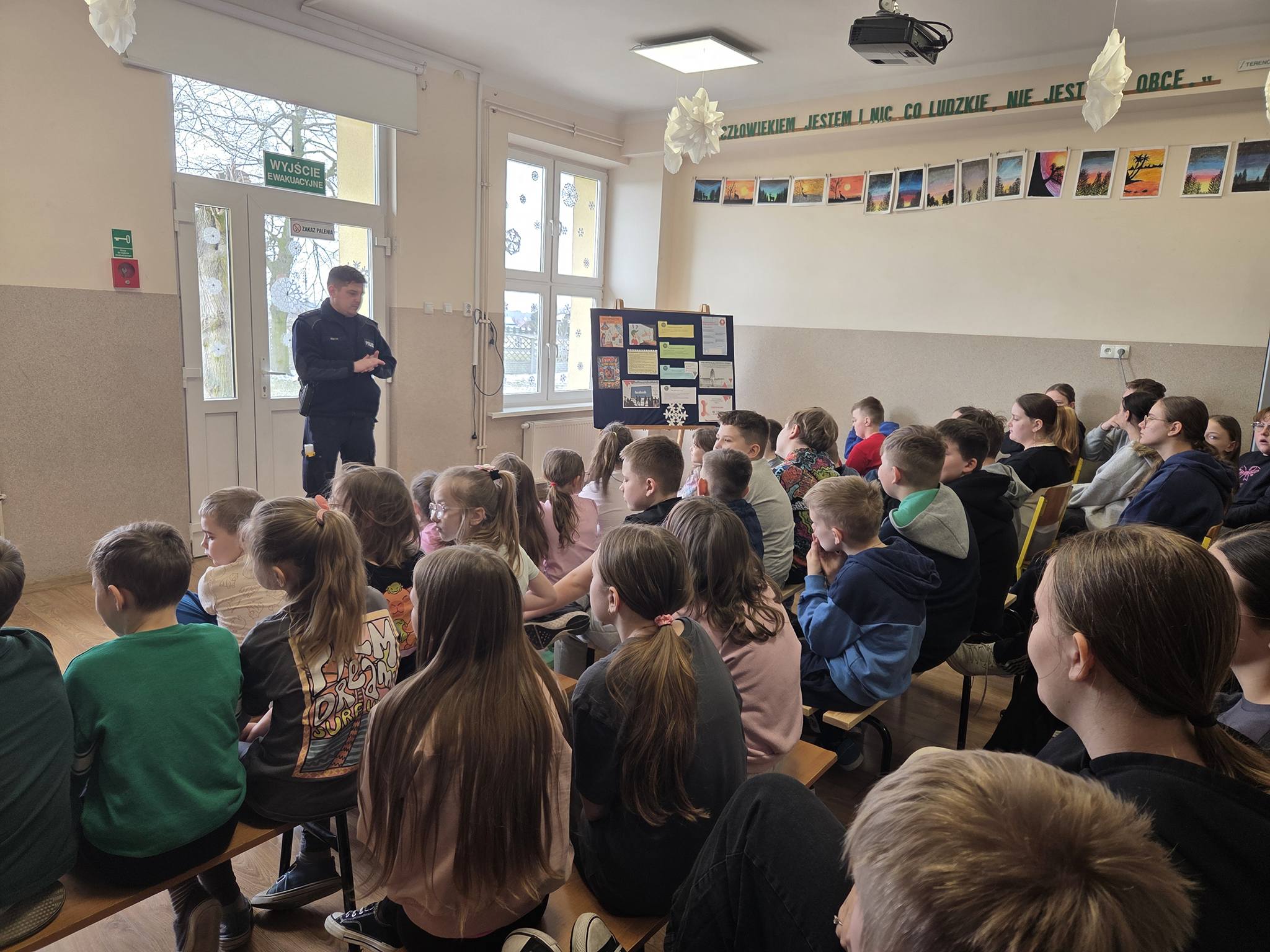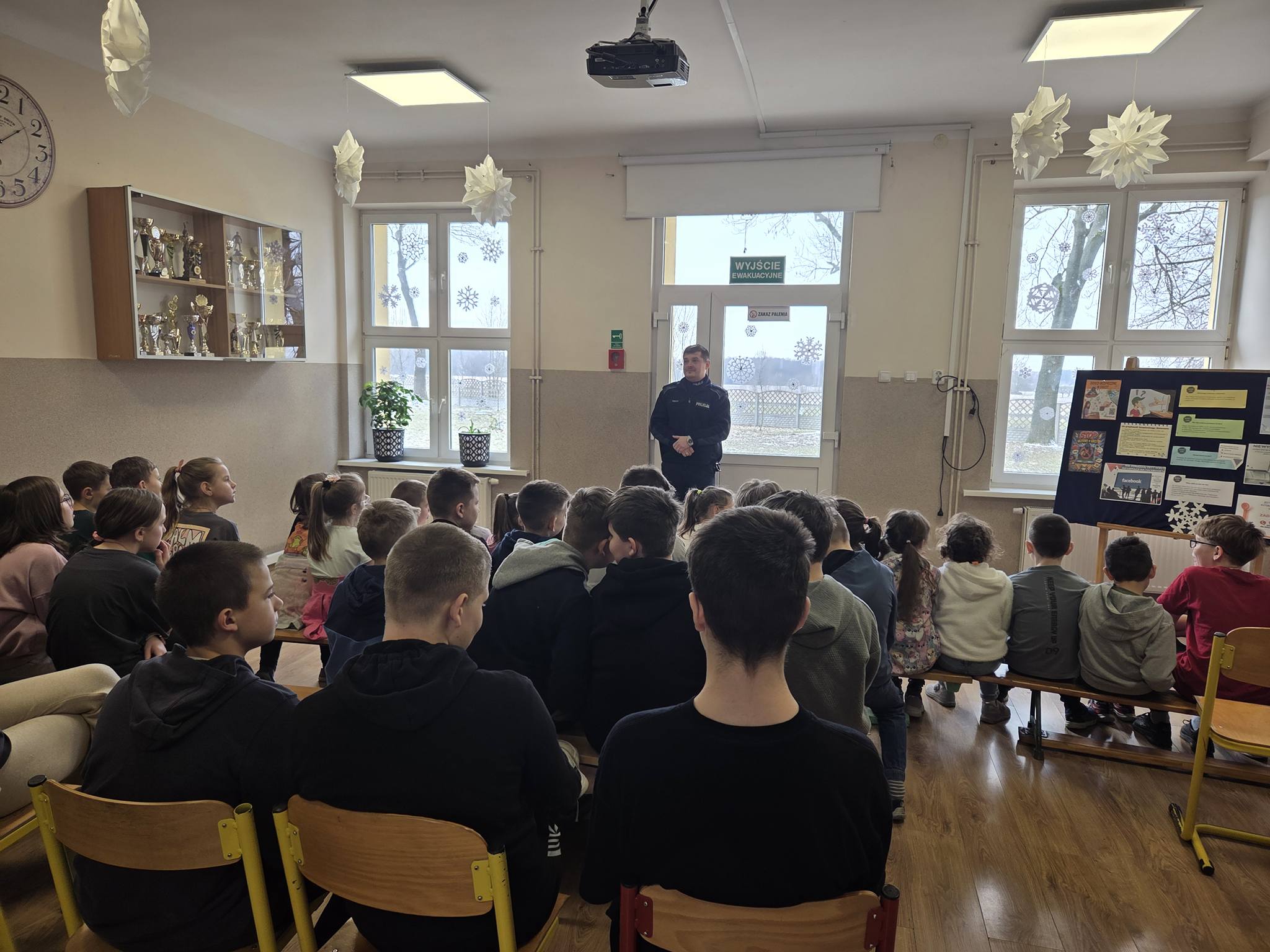 W trosce o bezpieczeństwo naszych uczniów w czasie ferii zimowych 9 lutego zorganizowaliśmy spotkanie z policjantami. Funkcjonariusze przypomnieli uczniom zasady poruszania się po drodze oraz standardy bezpieczeństwa podczas uprawiania sportów zimowych i zabaw na świeżym powietrzu.