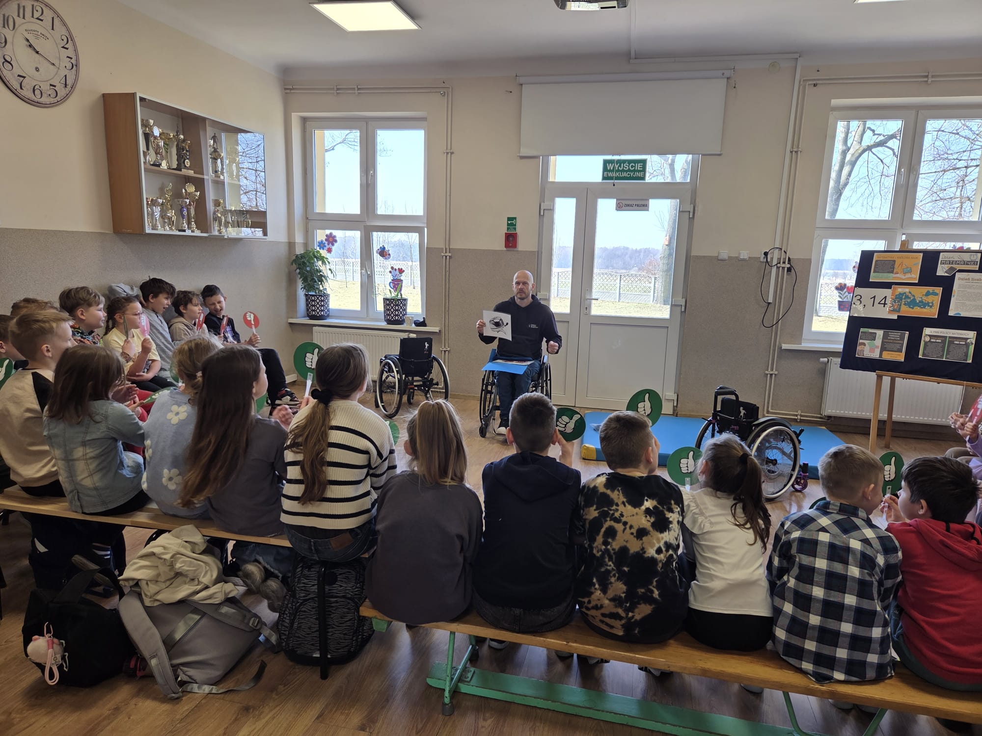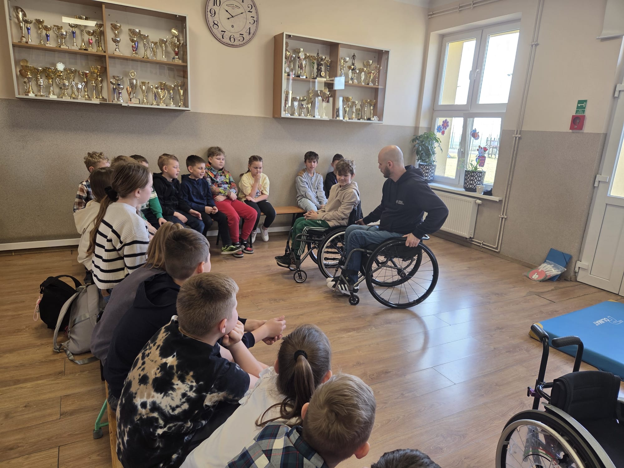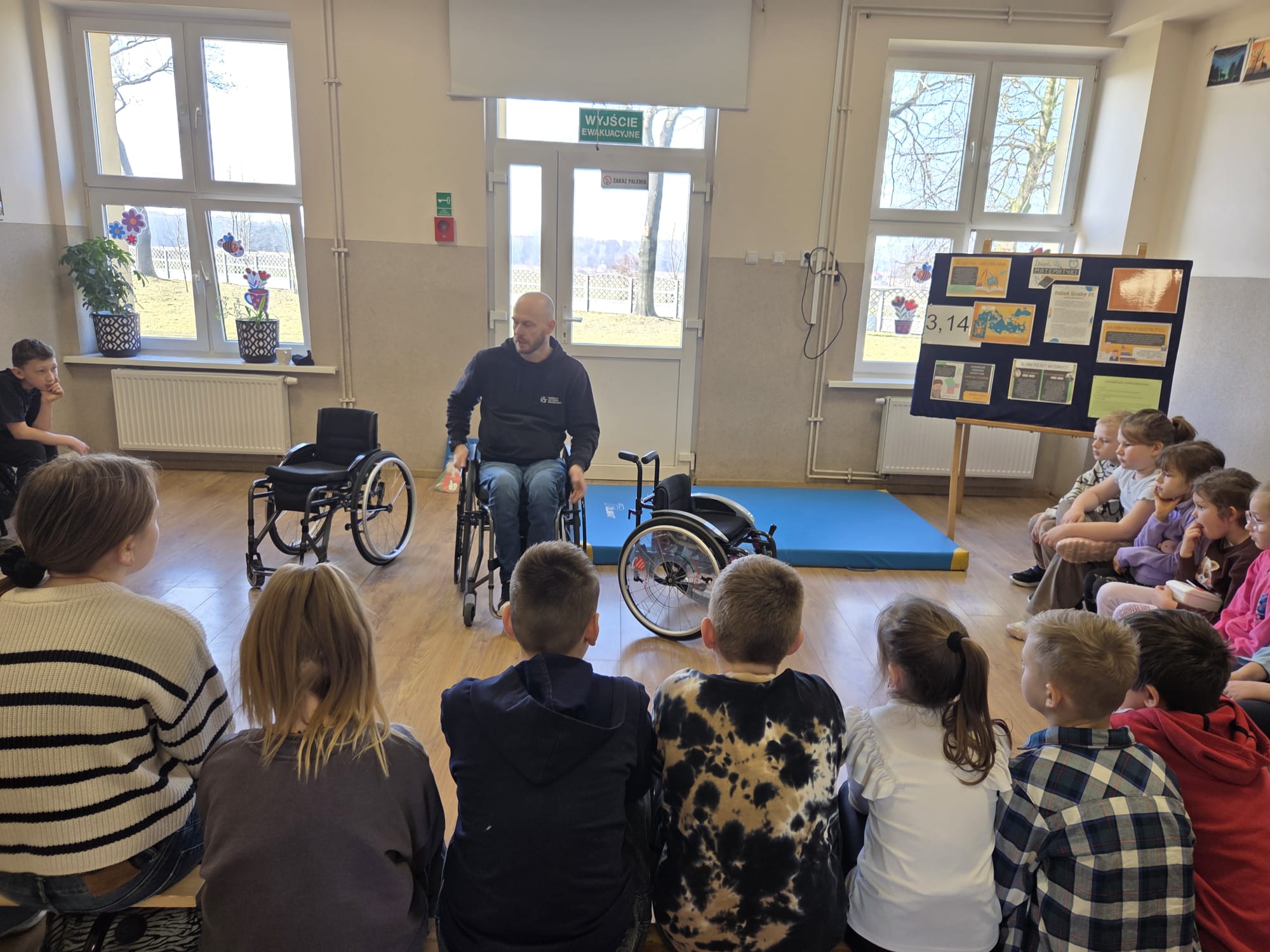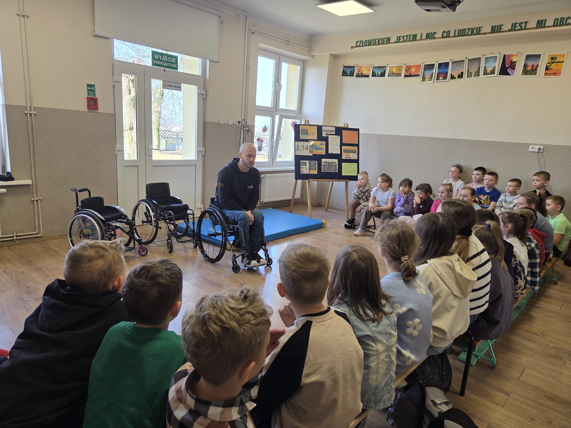 Gość spotkał się z uczniami (w dwóch grupach wiekowych), aby opowiedzieć o tym, jak wygląda życie z niepełnosprawnością ruchową.