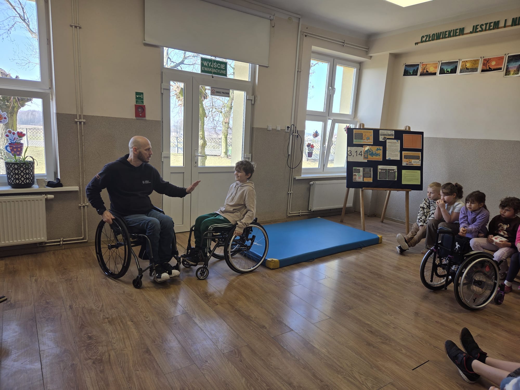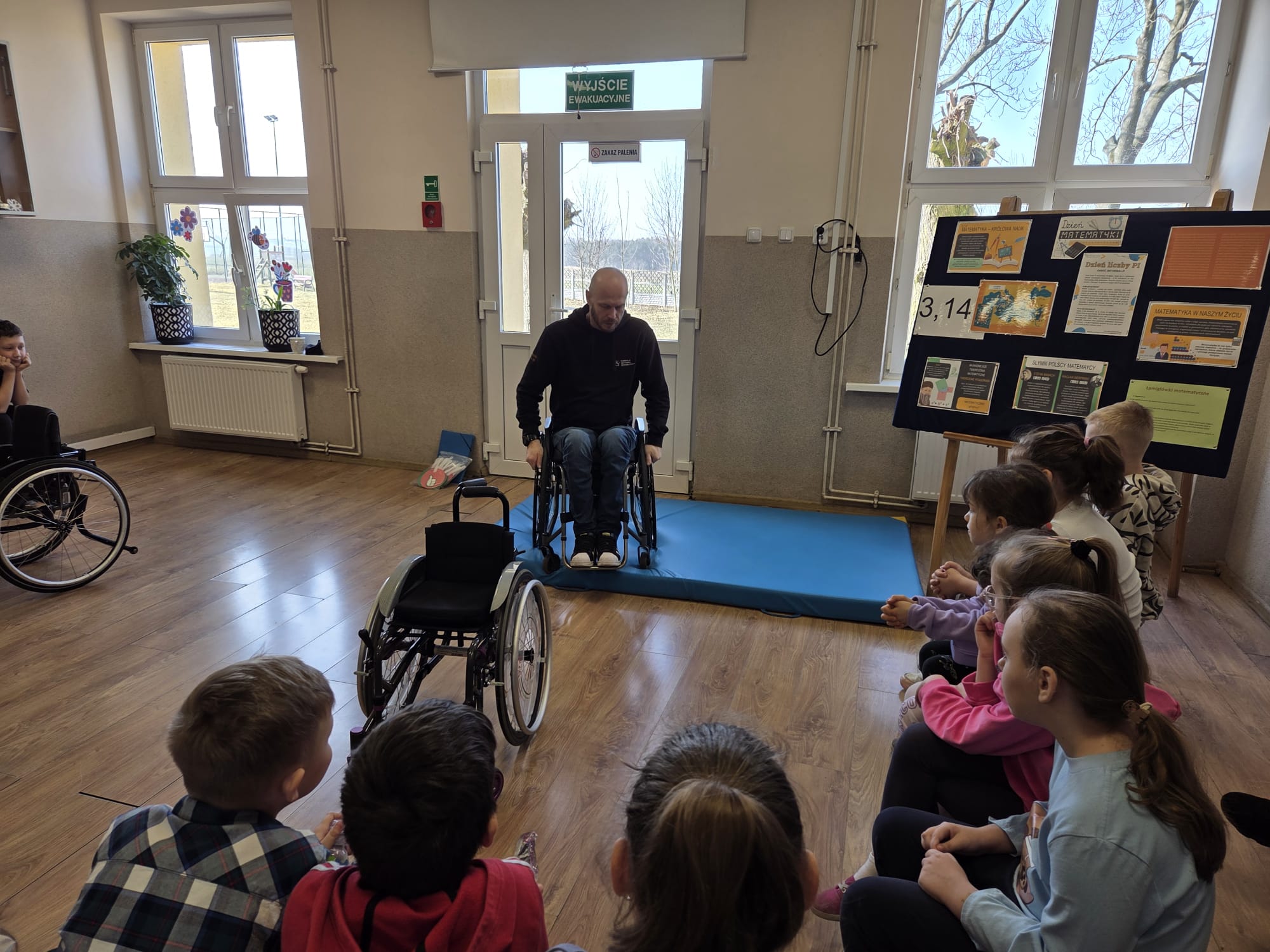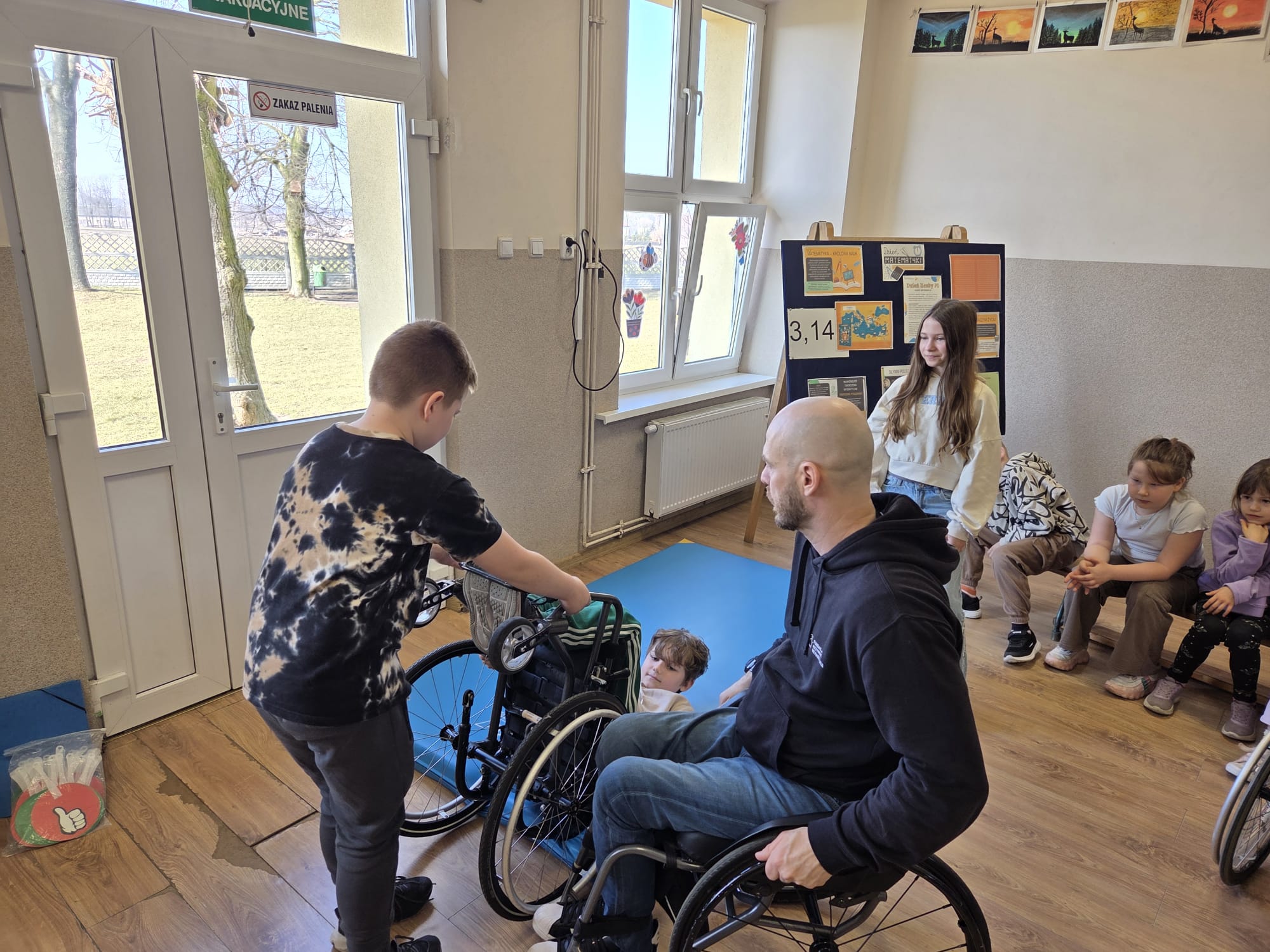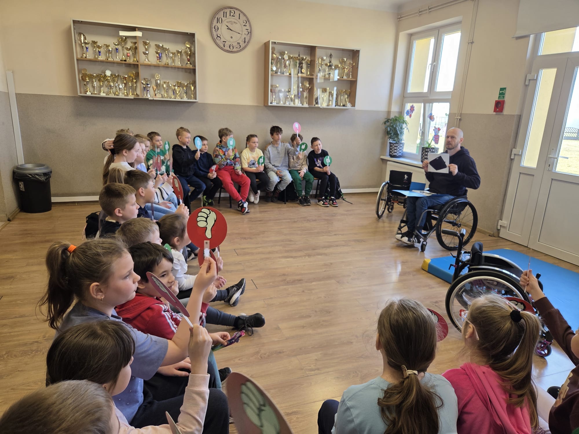 Gość spotkał się z uczniami (w dwóch grupach wiekowych), aby opowiedzieć o tym, jak wygląda życie z niepełnosprawnością ruchową.