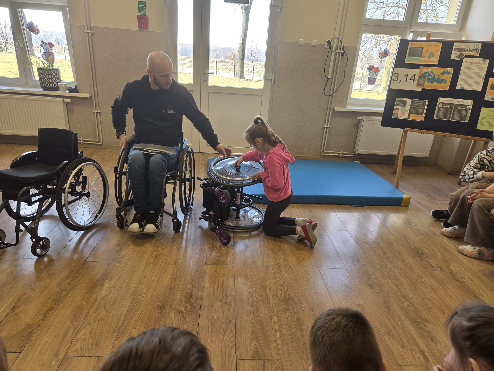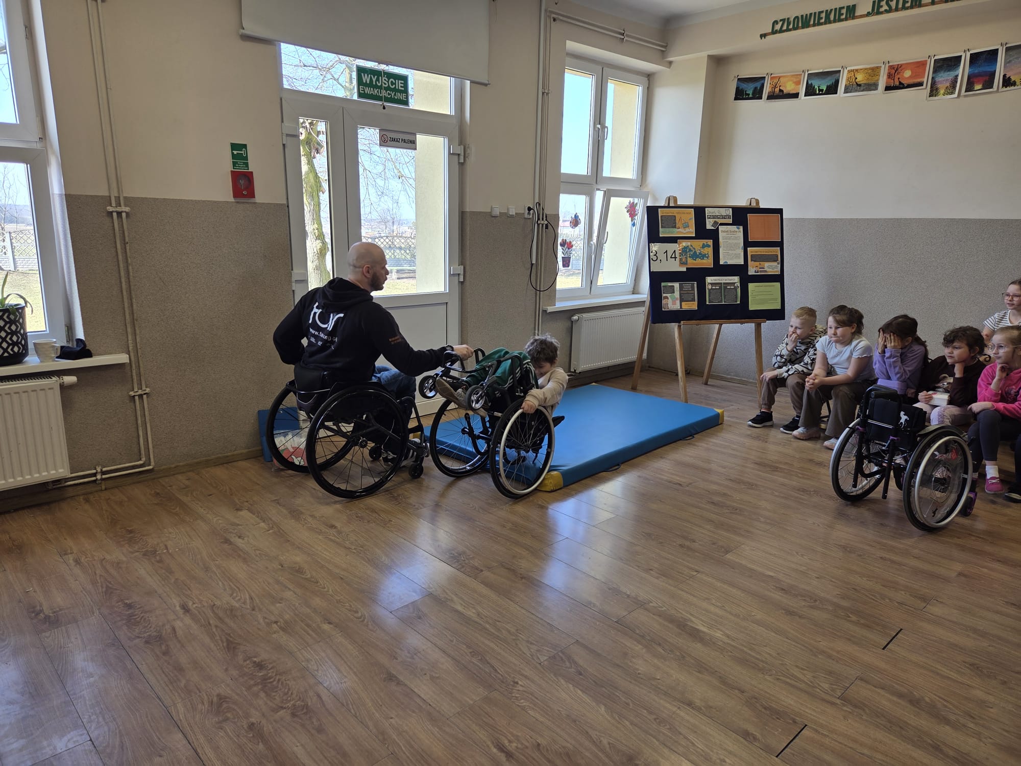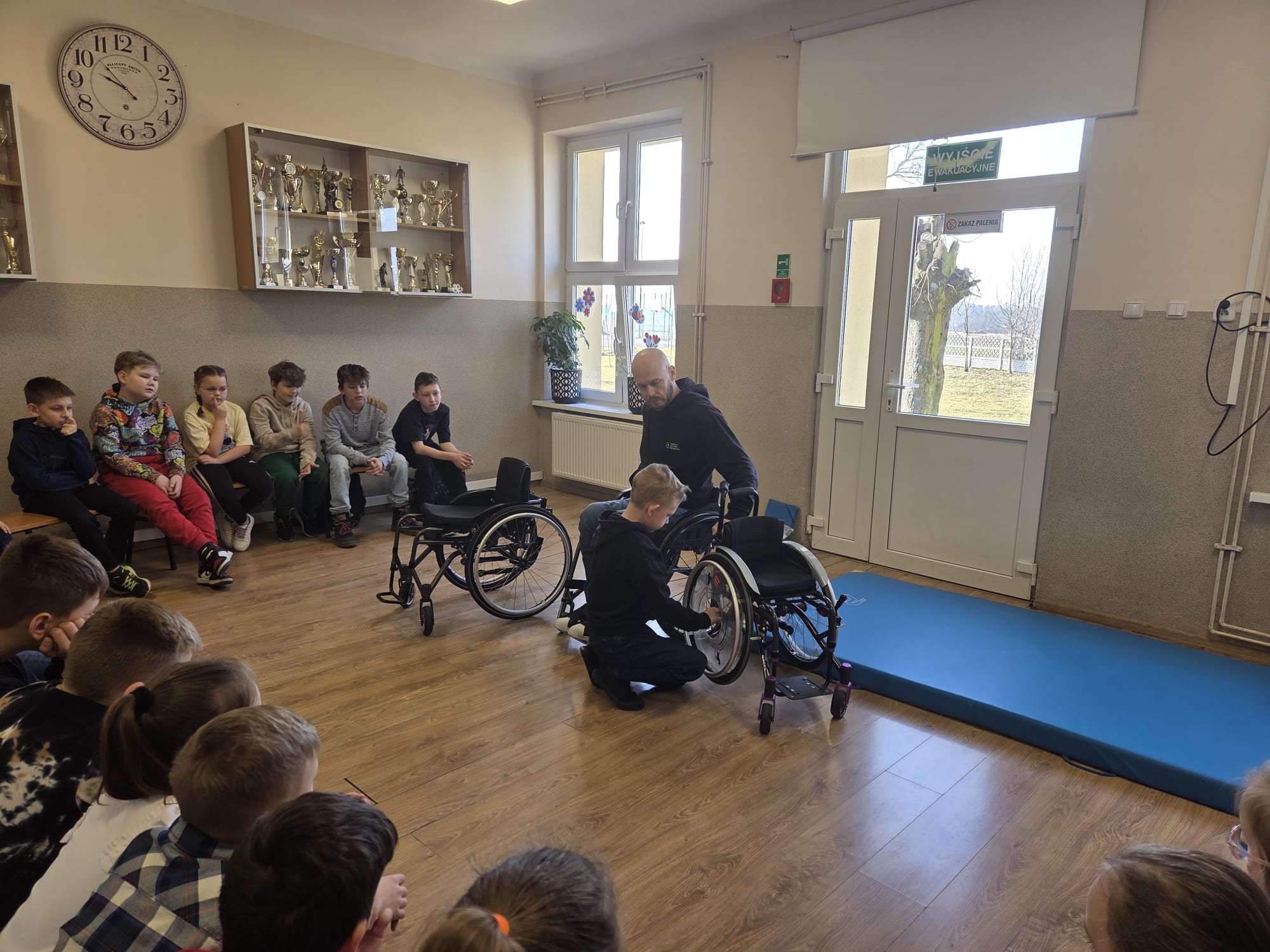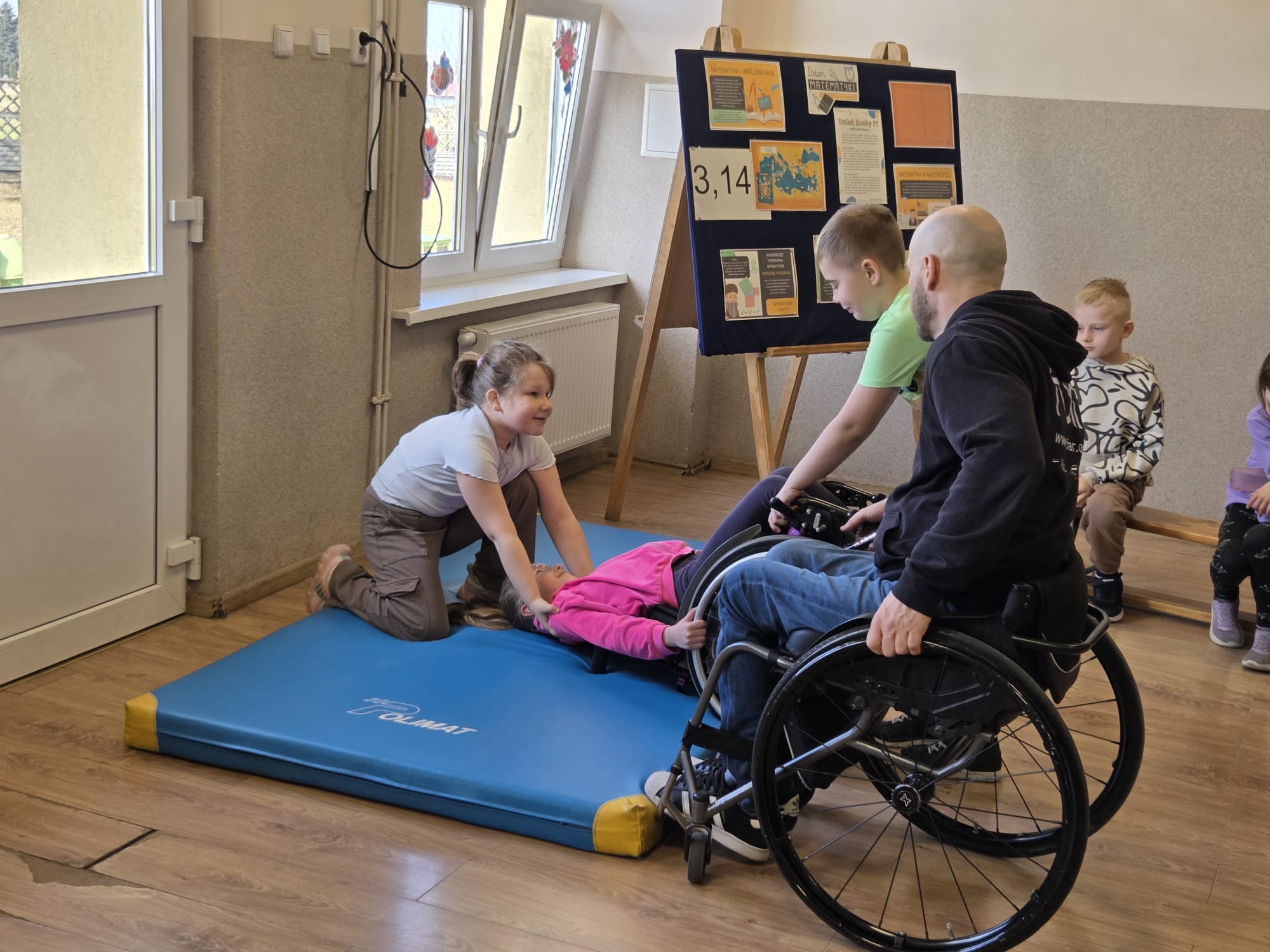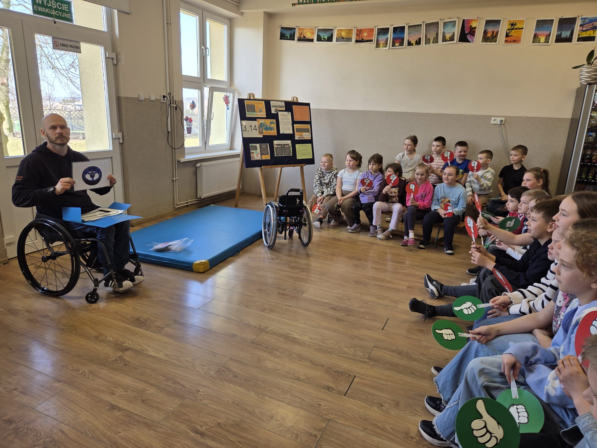 Gość spotkał się z uczniami (w dwóch grupach wiekowych), aby opowiedzieć o tym, jak wygląda życie z niepełnosprawnością ruchową.