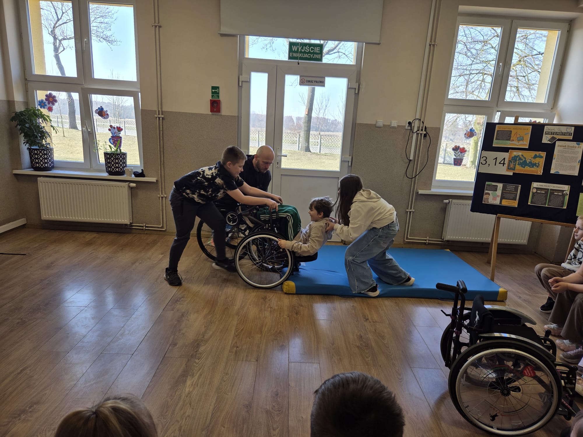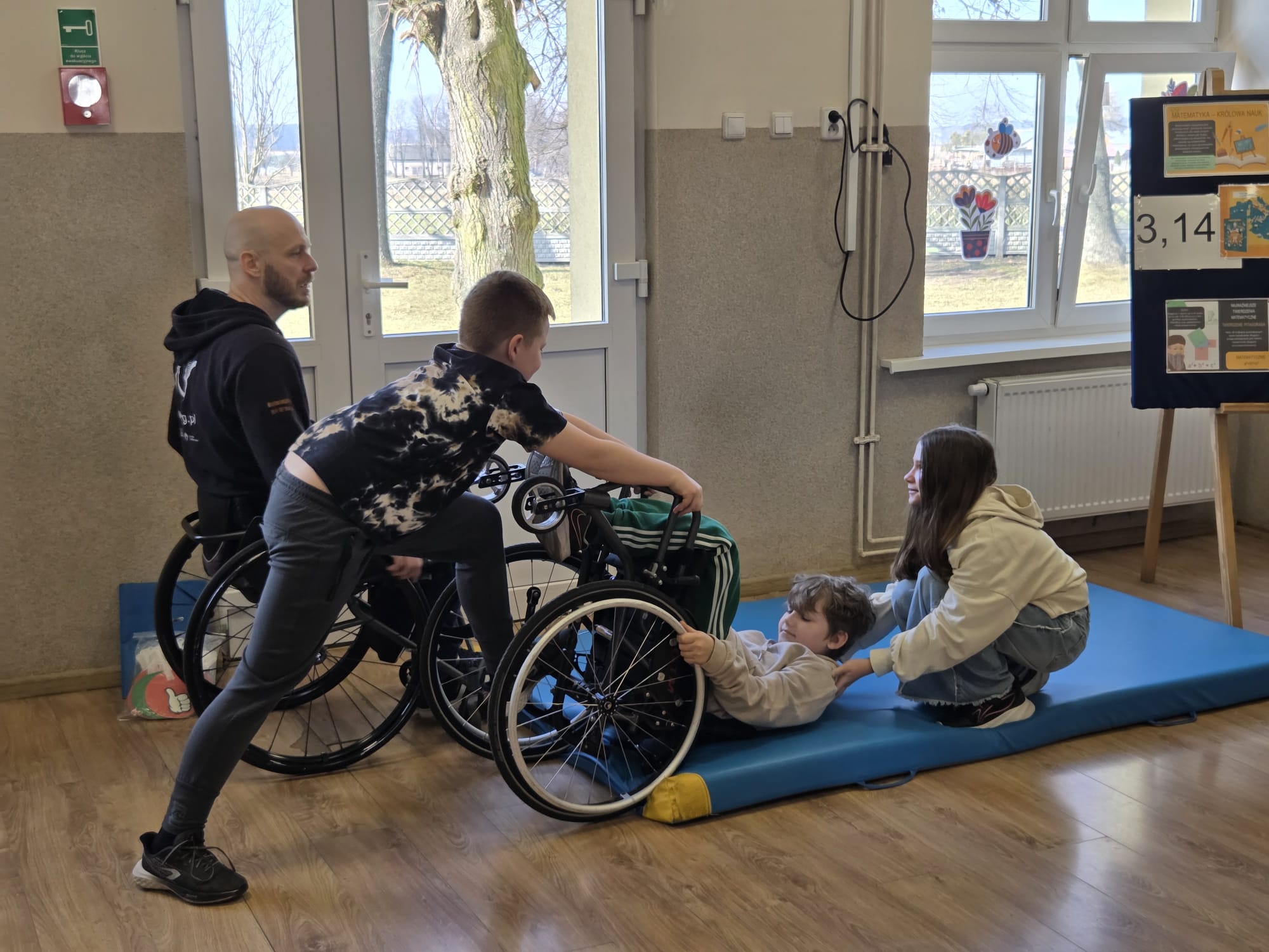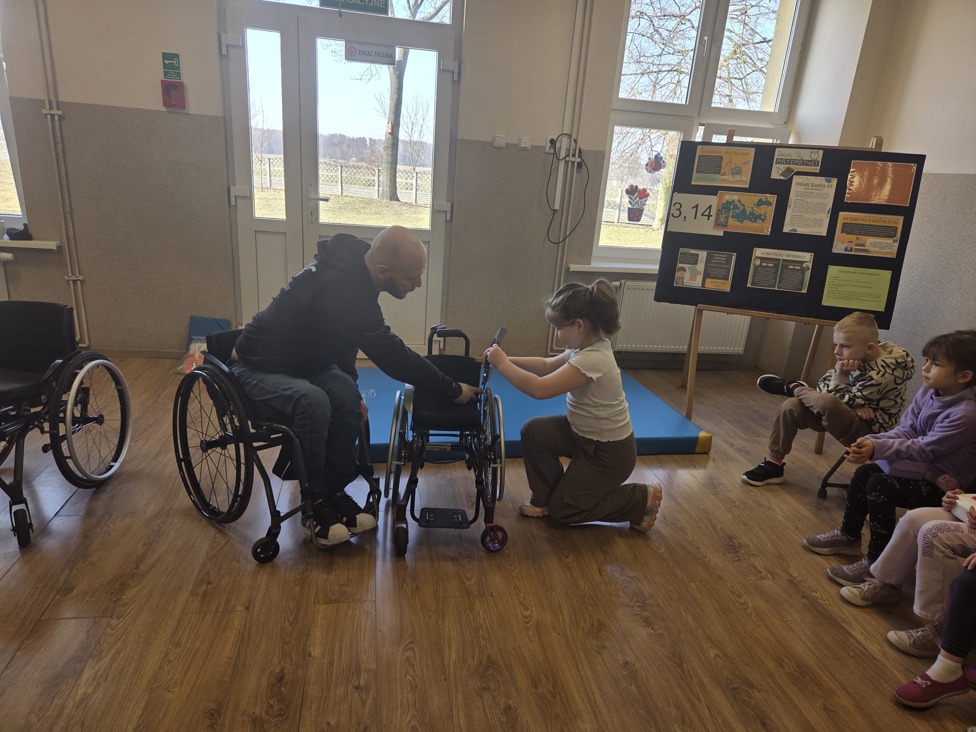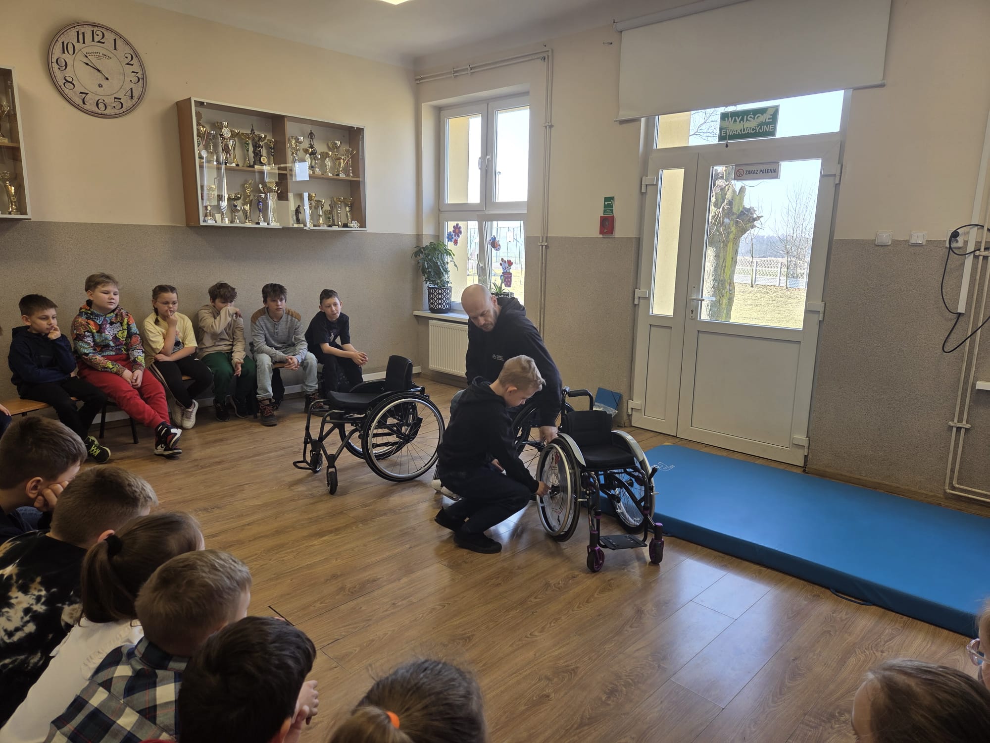 Gość spotkał się z uczniami (w dwóch grupach wiekowych), aby opowiedzieć o tym, jak wygląda życie z niepełnosprawnością ruchową.