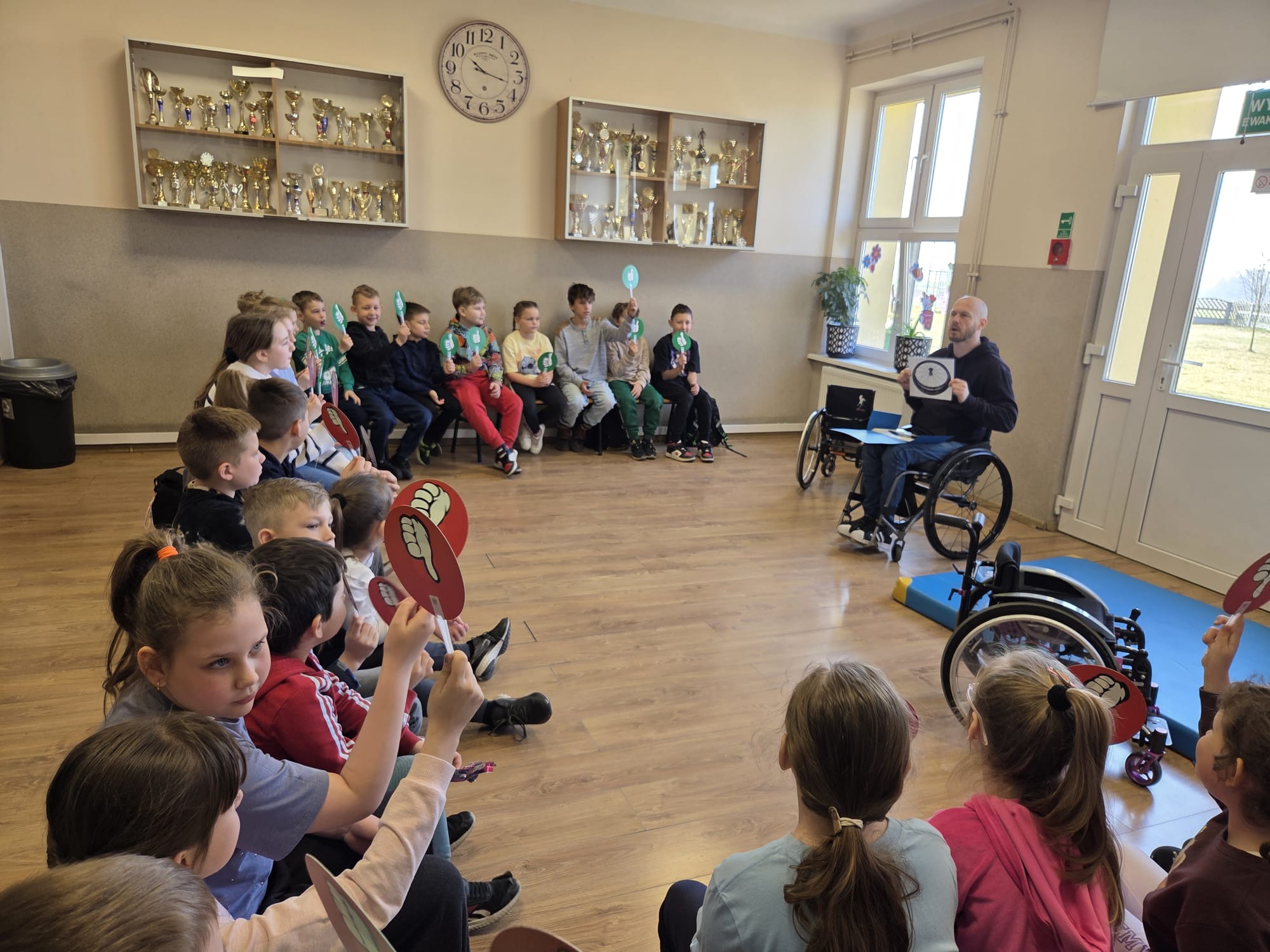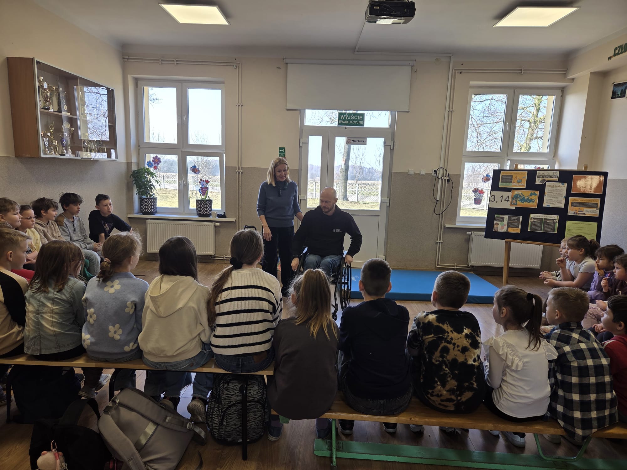 Dzisiaj w SP w Strzałkowie gościliśmy wyjątkową osobę – pana Dawida Federa z poznańskiego oddziału Fundacji Aktywnej Rehabilitacji.