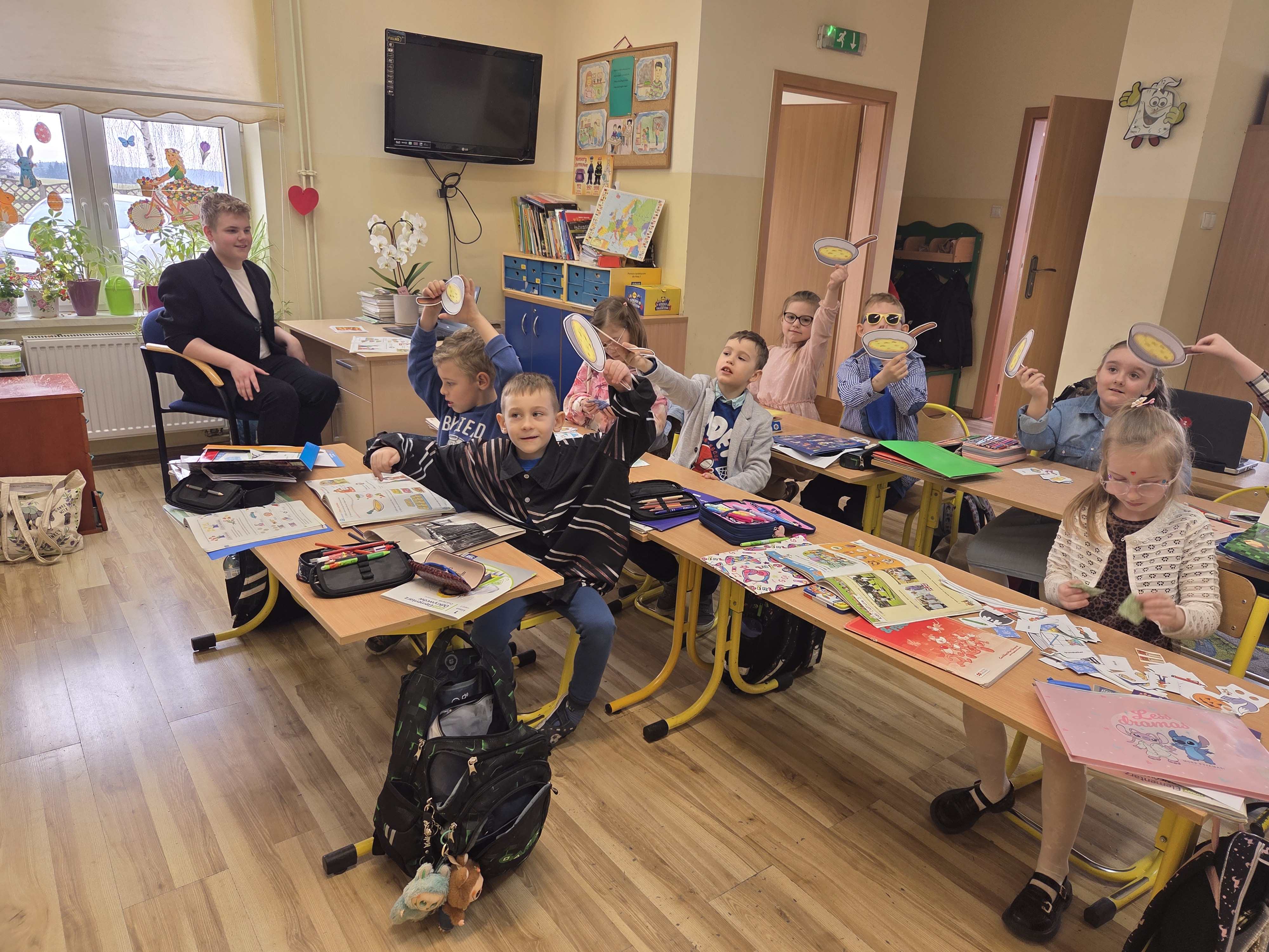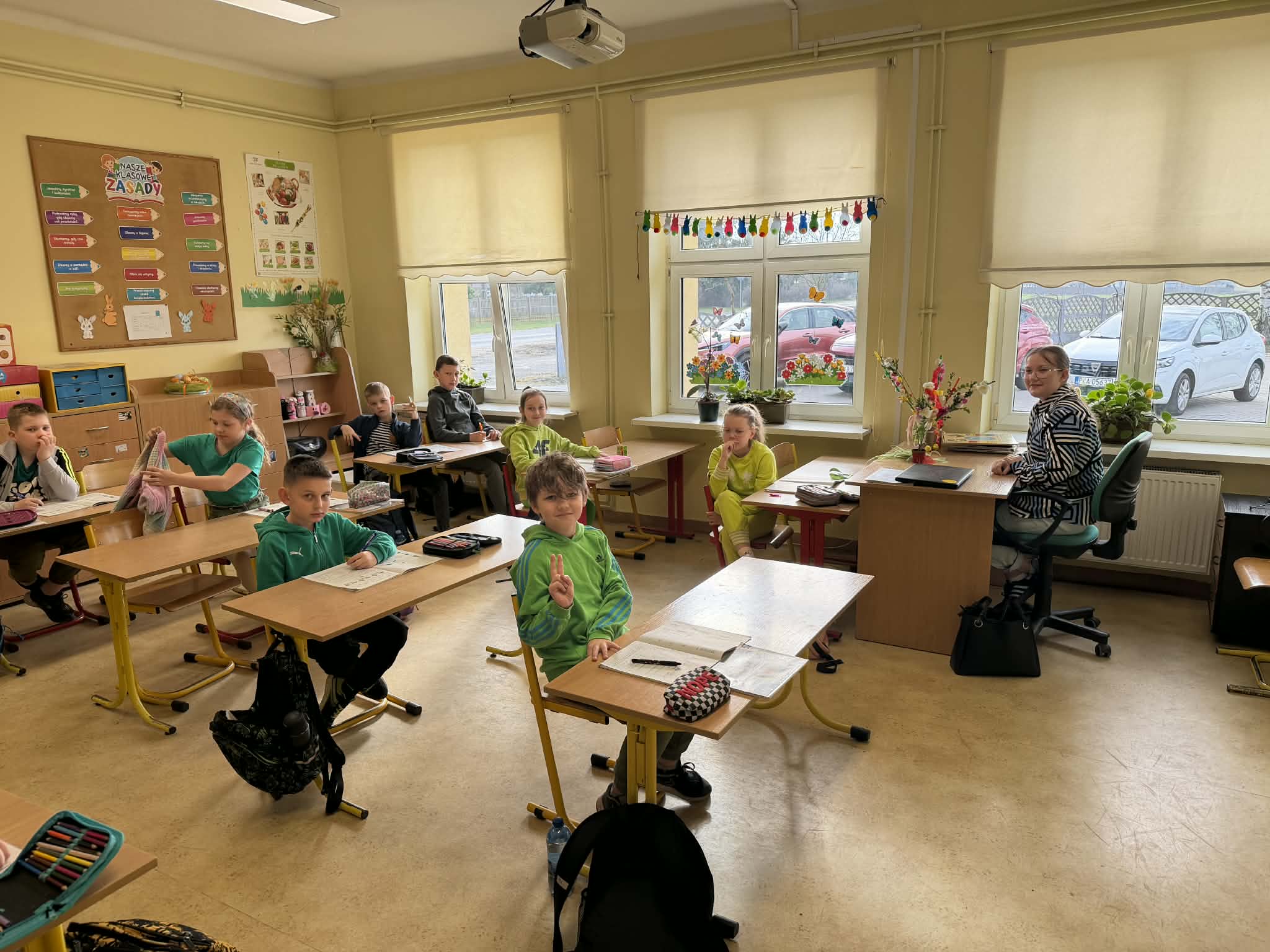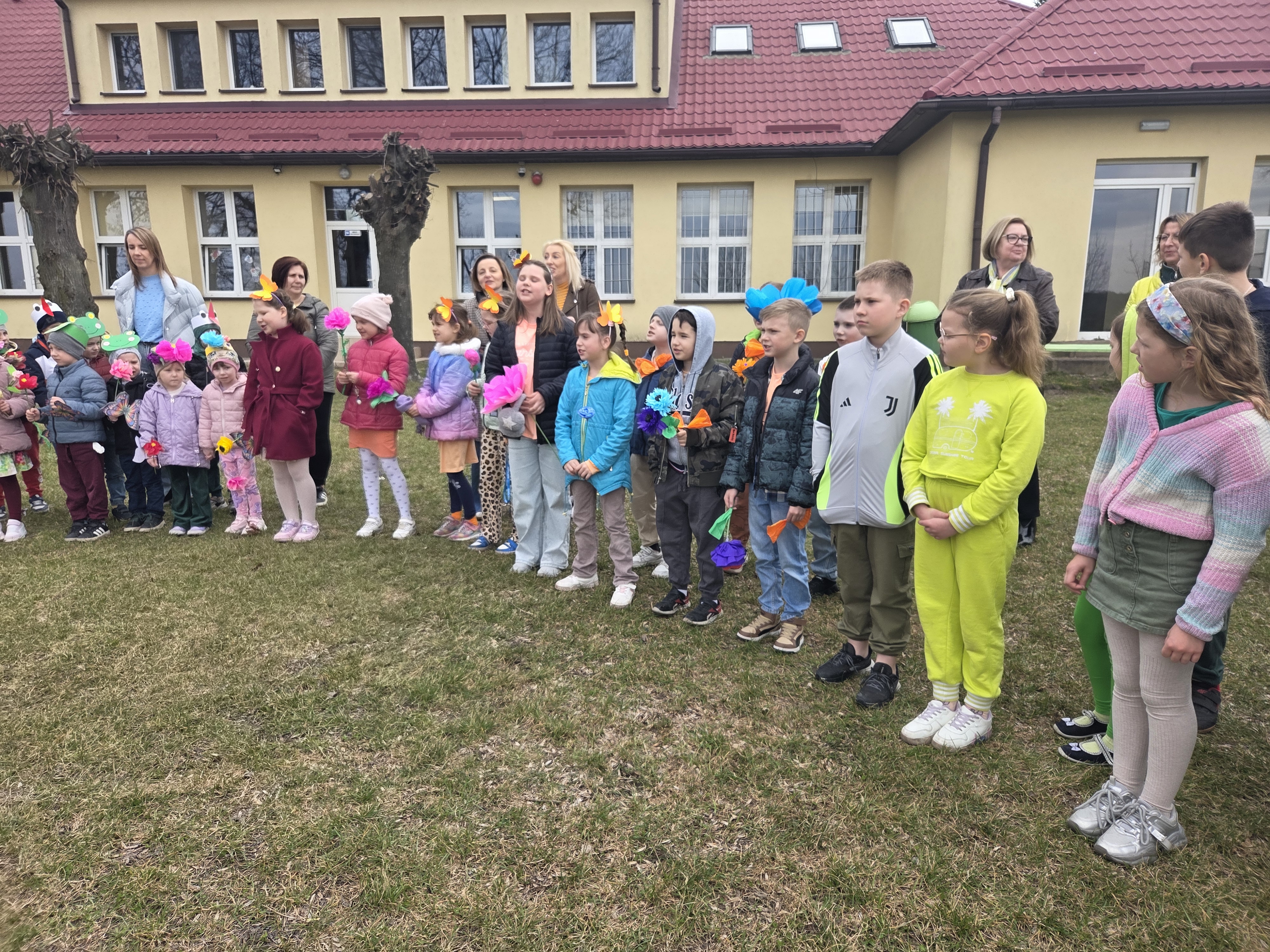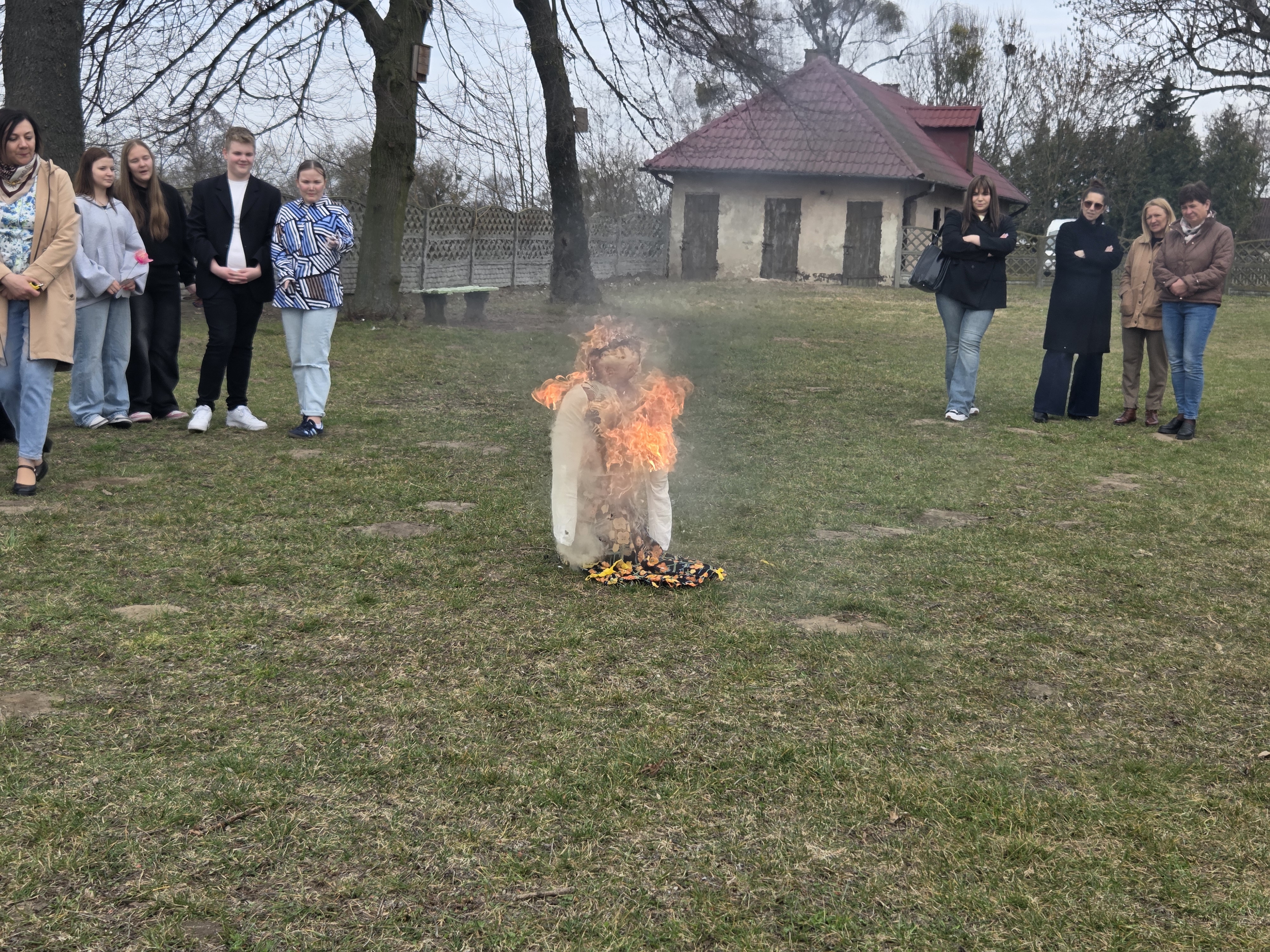 I postarali się, aby lekcje były ciekawe, a uczniowie zadowoleni. Mieli przy tym niebywałą okazję do zdobywania cennych doświadczeń związanych z pracą nauczyciela. Po zakończonych zajęciach uczniowie zaprezentowali swoje wrażenia dotyczące prowadzenia zajęć z młodszymi kolegami i koleżankami. Po czym jedna z uczennic wyraziła chęć pracy w zawodzie nauczyciela w przyszłości. W trosce o ochronę środowiska przyrodniczego pierwszaki zaprezentowały pokaz siatek wielorazówek, zachęcając tym samym do rezygnacji z nadmiernego używania toreb foliowych podczas robienia zakupów. Następnie udaliśmy się na boisko, gdzie jak tradycja nakazuje spaliliśmy słomianą kukłę, symbol odchodzącej zimy. Śpiewaliśmy piosenki na powitanie nowej pory roku. Pierwszy dzień wiosny przywitał nas piękną pogodą. Mamy nadzieję, że wiosna już na stałe u nas zagości.