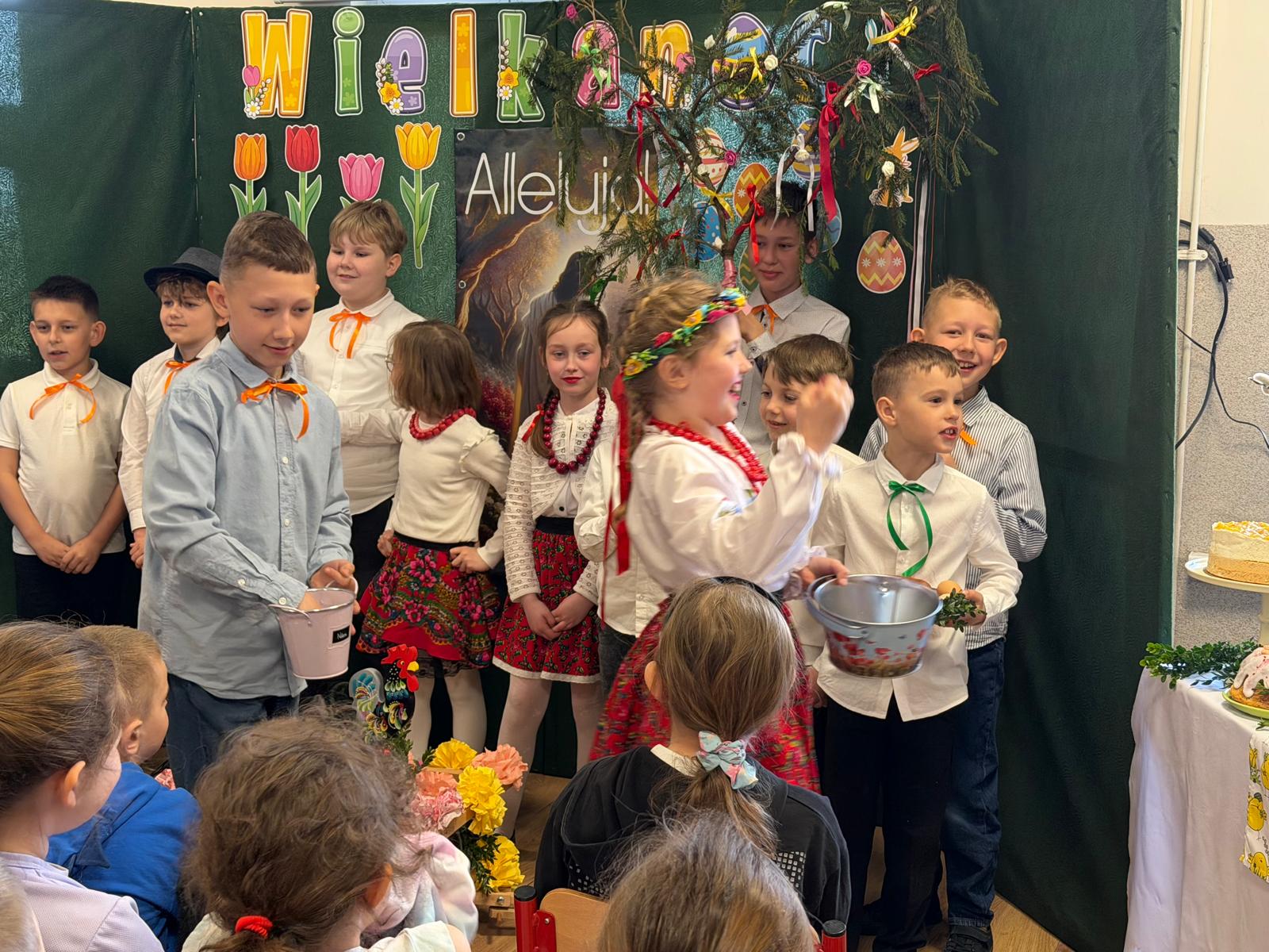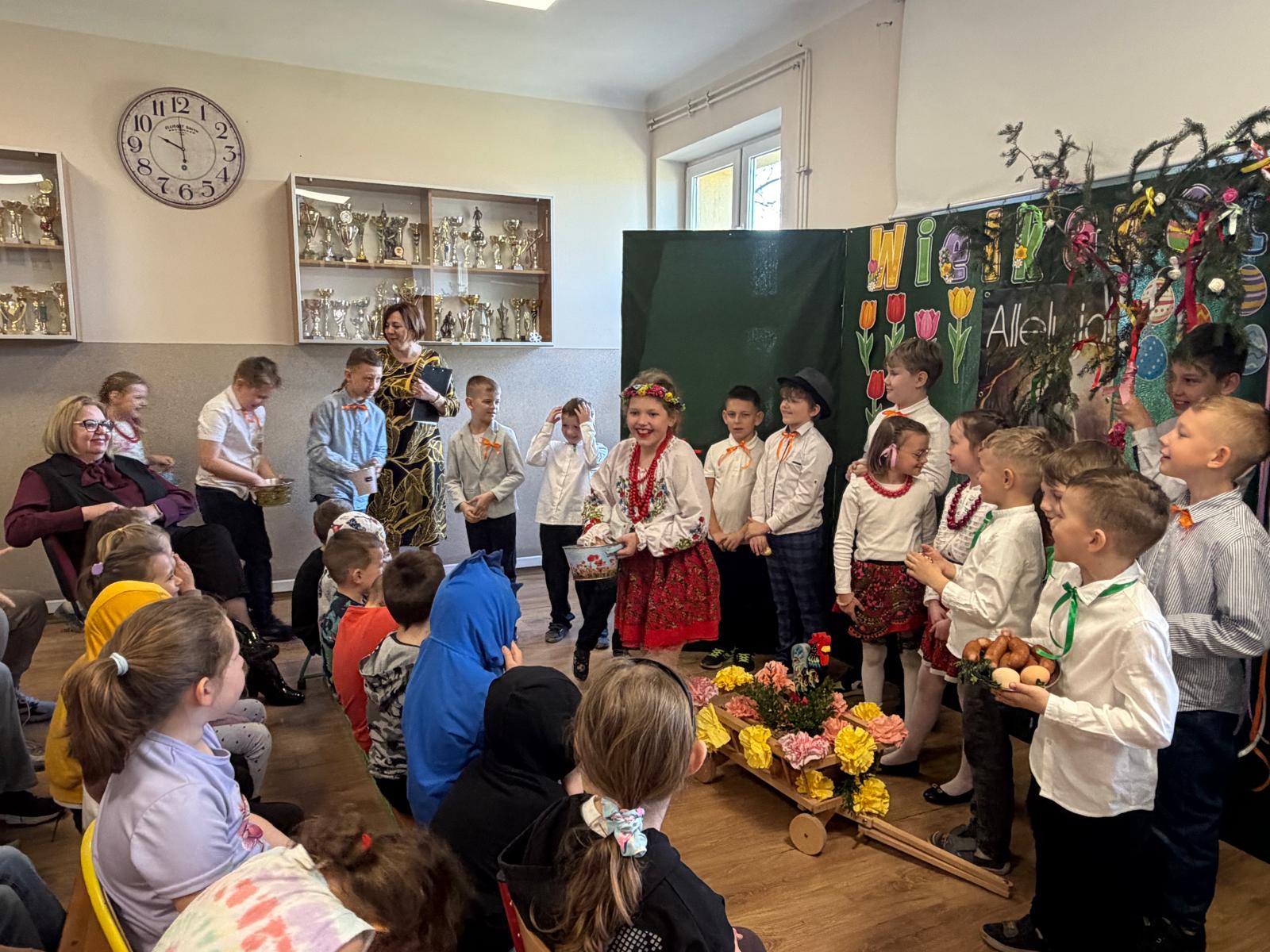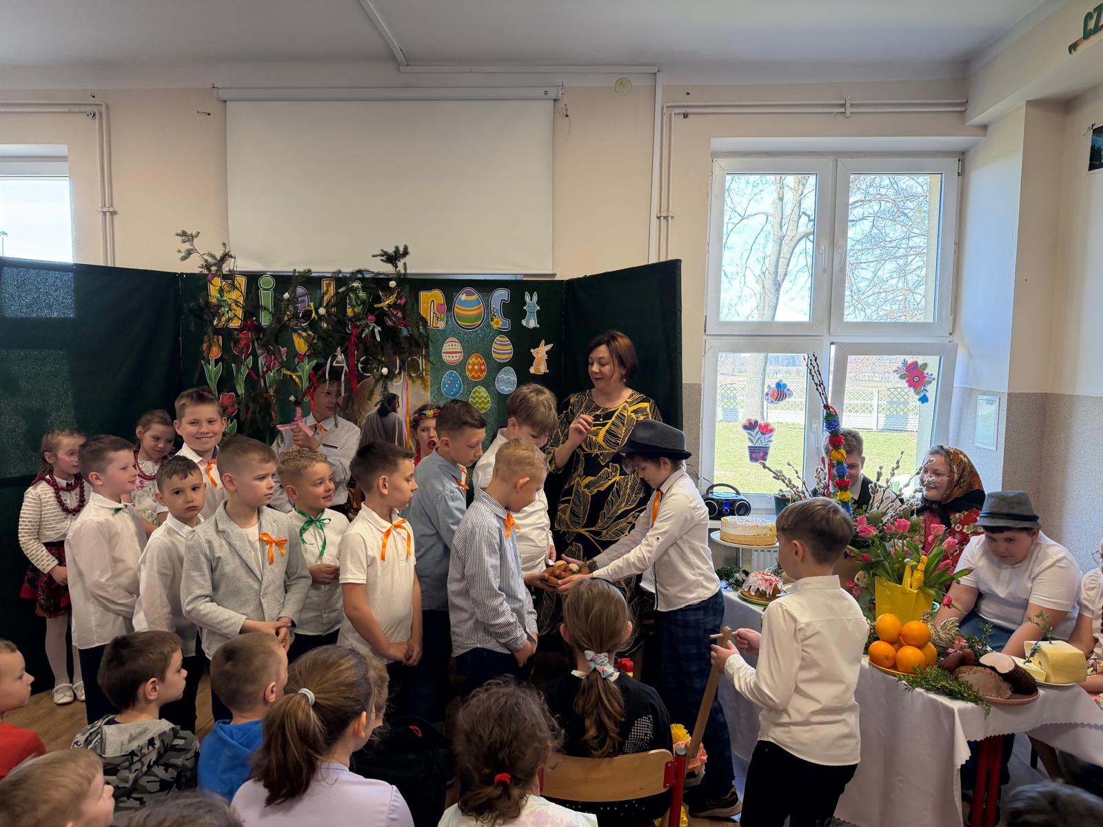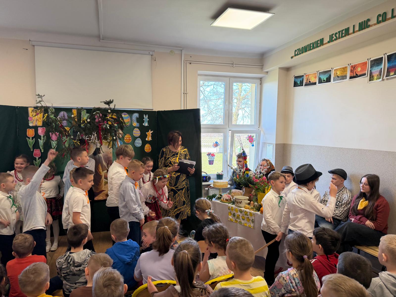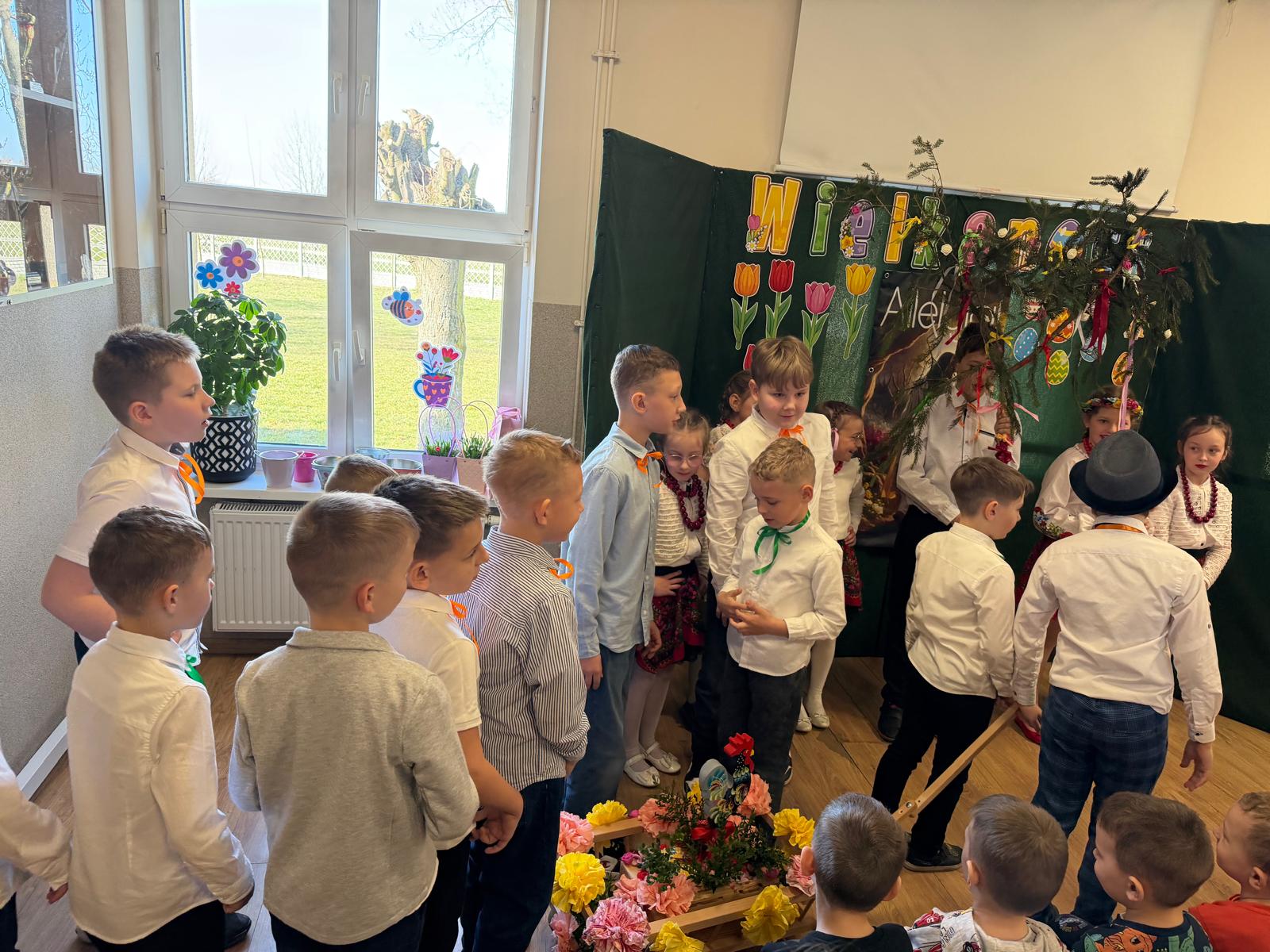 Są zwyczaje, które kultywujemy, ale są także te o których już nie pamiętamy. W odświętnych strojach, w ludowej stylizacji dziewczynki z klasy I i III przybliżyły nam zwyczaj Chodzenia z gaikiem, czyli zieloną gałęzią, przeważnie sosny lub świerku, przyozdobioną kolorowymi wstążkami, świecidłami, kwiatami, jest słowiańskim obrzędem, mającym przyśpieszyć nadejście wiosny. Zwyczaj ten wywodzi się z czasów dawniejszych niż chrześcijaństwo. Związany jest z obserwacją natury i odradzaniem się przyrody na wiosnę Kolor zielony symbolizuje odrodzenie się przyrody. Kolorowe ozdoby akcentują rozkwitającą wiosnę. Dziewczyny, które chodziły z gaikiem śpiewały piosenkę , w której życzyły szczęścia i pomyślności odwiedzanym gospodarzom. A gospodarze w zamian obdarowywali je jajkami i pisankami. W Poniedziałek Wielkanocny chłopcy obchodzili wieś z ciągniętym na drewnianym wózku kogutem. - Wózek ten był pomalowany najczęściej na czerwono, bowiem kolor ten w tradycji ludowej chronił od złych mocy i symbolizował siły witalne. Ozdobiony był także wstążkami, kwiatami. Kogut był gliniany lub drewniany. Kiedy któryś z młodzieńców wpadł w oko pannie, dostawał od niej jajka. A jeśli podobał jej się na tyle, że w grę wchodziło małżeństwo, obdarowywała go pisanką. Przez całe wieki chodzenie z kogutkiem było nieodłącznym elementem świąt Wielkanocy, niestety tradycja ta już realnie zanikła, ale chłopcy z klas I i III pięknie nam o niej przypomnieli. A na koniec naszego przedstawienia kultywowaliśmy zwyczaj- Śmigusa-dyngusa, powodując wybuch euforii u dzieci. Wszystkim uczestnikom naszego spotkania życzyliśmy żeby te Święta Wielkanocne przepełnione były wiarą, radością, miłością, spokojem i nadzieją. A te spędzone w rodzinnym gronie chwile żeby zostały w sercach i wracały jako dobre wspomnienia.
