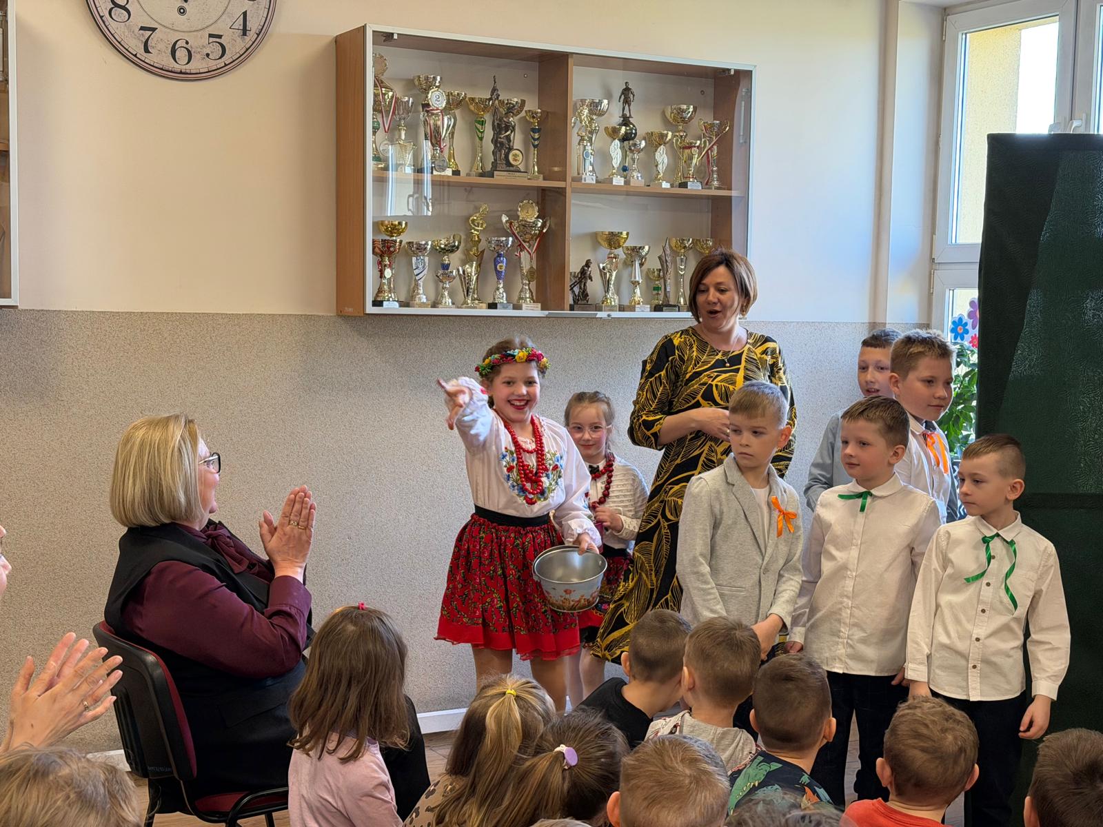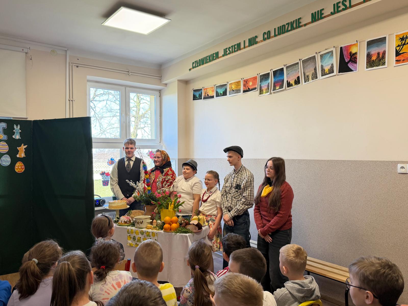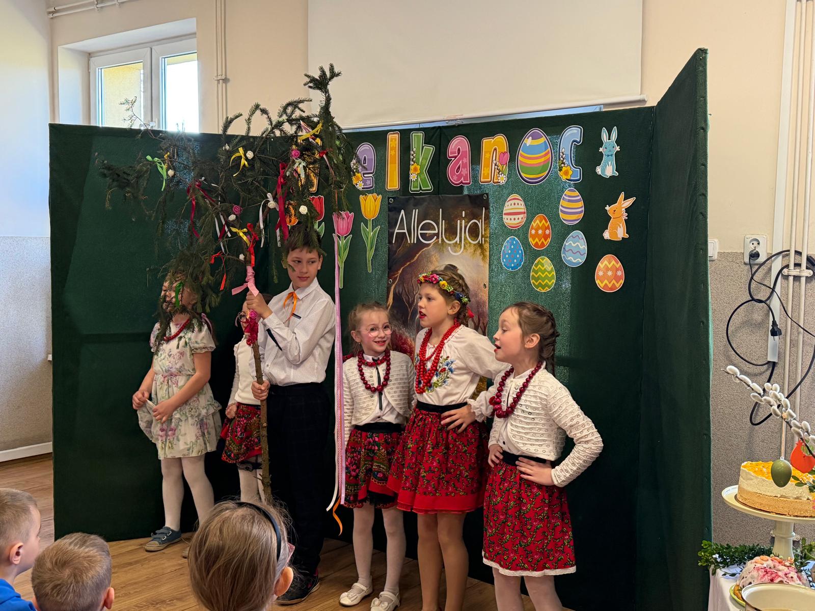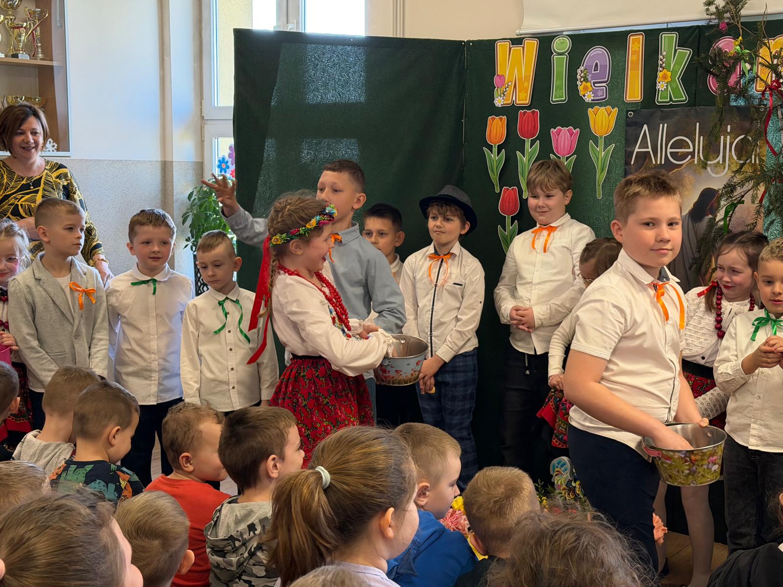 Są zwyczaje, które kultywujemy, ale są także te o których już nie pamiętamy. W odświętnych strojach, w ludowej stylizacji dziewczynki z klasy I i III przybliżyły nam zwyczaj Chodzenia z gaikiem, czyli zieloną gałęzią, przeważnie sosny lub świerku, przyozdobioną kolorowymi wstążkami, świecidłami, kwiatami, jest słowiańskim obrzędem, mającym przyśpieszyć nadejście wiosny. Zwyczaj ten wywodzi się z czasów dawniejszych niż chrześcijaństwo. Związany jest z obserwacją natury i odradzaniem się przyrody na wiosnę Kolor zielony symbolizuje odrodzenie się przyrody. Kolorowe ozdoby akcentują rozkwitającą wiosnę. Dziewczyny, które chodziły z gaikiem śpiewały piosenkę , w której życzyły szczęścia i pomyślności odwiedzanym gospodarzom. A gospodarze w zamian obdarowywali je jajkami i pisankami. W Poniedziałek Wielkanocny chłopcy obchodzili wieś z ciągniętym na drewnianym wózku kogutem. - Wózek ten był pomalowany najczęściej na czerwono, bowiem kolor ten w tradycji ludowej chronił od złych mocy i symbolizował siły witalne. Ozdobiony był także wstążkami, kwiatami. Kogut był gliniany lub drewniany. Kiedy któryś z młodzieńców wpadł w oko pannie, dostawał od niej jajka. A jeśli podobał jej się na tyle, że w grę wchodziło małżeństwo, obdarowywała go pisanką. Przez całe wieki chodzenie z kogutkiem było nieodłącznym elementem świąt Wielkanocy, niestety tradycja ta już realnie zanikła, ale chłopcy z klas I i III pięknie nam o niej przypomnieli. A na koniec naszego przedstawienia kultywowaliśmy zwyczaj- Śmigusa-dyngusa, powodując wybuch euforii u dzieci. Wszystkim uczestnikom naszego spotkania życzyliśmy żeby te Święta Wielkanocne przepełnione były wiarą, radością, miłością, spokojem i nadzieją. A te spędzone w rodzinnym gronie chwile żeby zostały w sercach i wracały jako dobre wspomnienia.