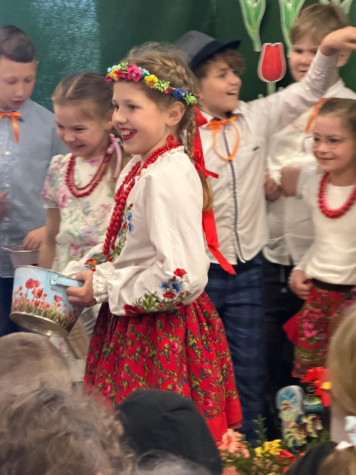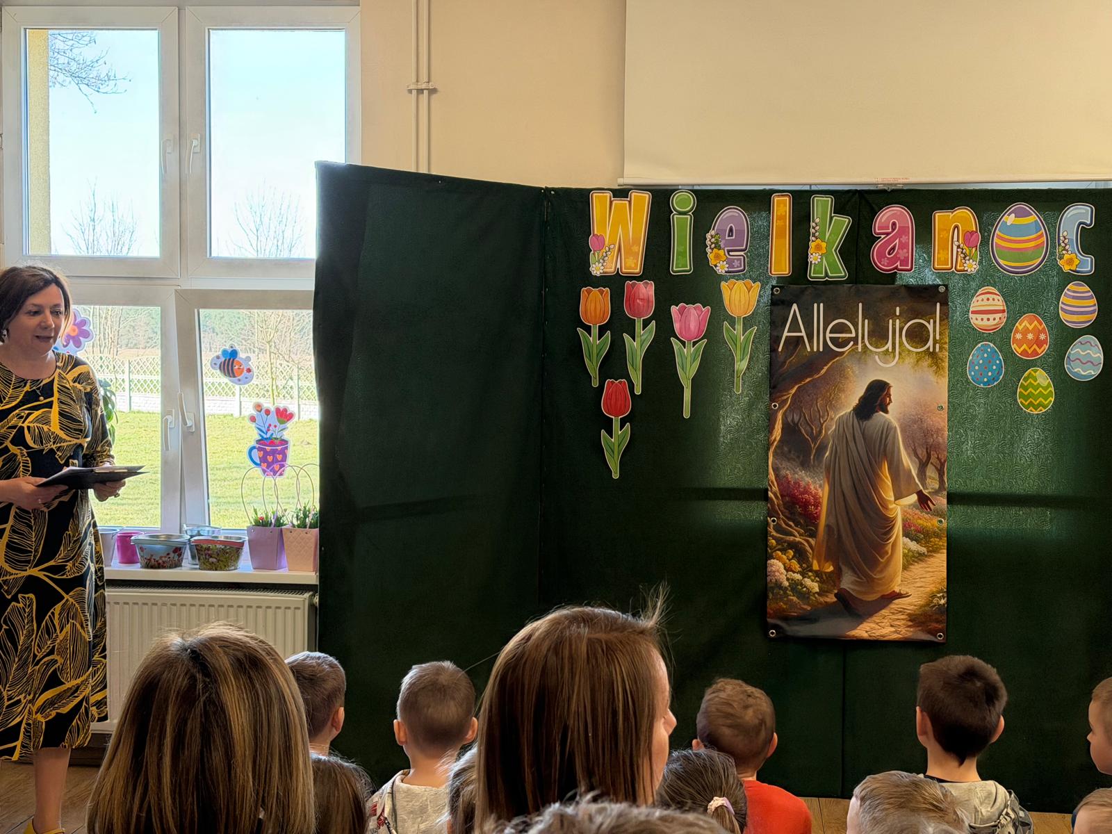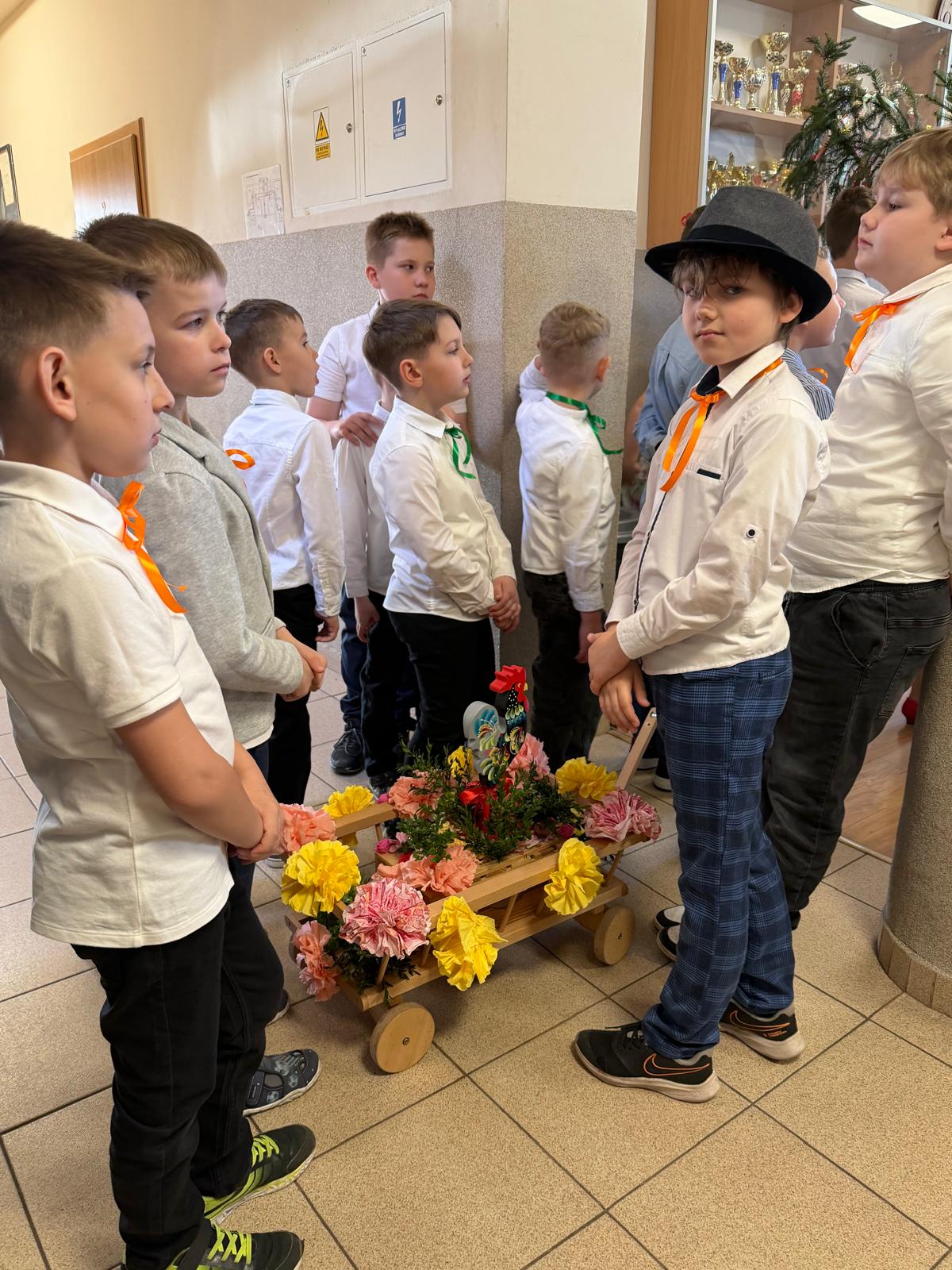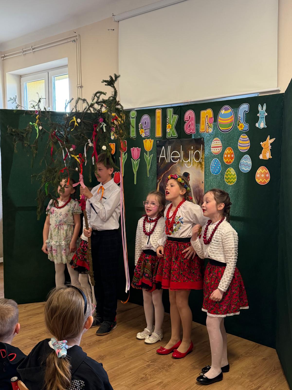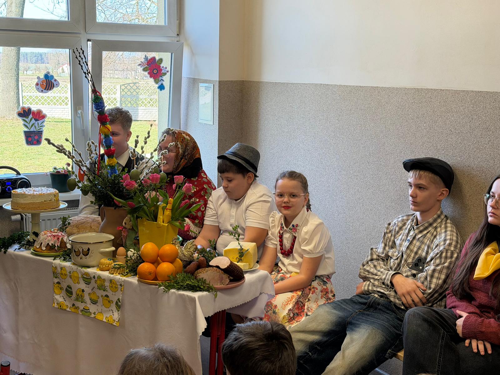 Są zwyczaje, które kultywujemy, ale są także te o których już nie pamiętamy. W odświętnych strojach, w ludowej stylizacji dziewczynki z klasy I i III przybliżyły nam zwyczaj Chodzenia z gaikiem, czyli zieloną gałęzią, przeważnie sosny lub świerku, przyozdobioną kolorowymi wstążkami, świecidłami, kwiatami, jest słowiańskim obrzędem, mającym przyśpieszyć nadejście wiosny. Zwyczaj ten wywodzi się z czasów dawniejszych niż chrześcijaństwo. Związany jest z obserwacją natury i odradzaniem się przyrody na wiosnę Kolor zielony symbolizuje odrodzenie się przyrody. Kolorowe ozdoby akcentują rozkwitającą wiosnę. Dziewczyny, które chodziły z gaikiem śpiewały piosenkę , w której życzyły szczęścia i pomyślności odwiedzanym gospodarzom. A gospodarze w zamian obdarowywali je jajkami i pisankami. W Poniedziałek Wielkanocny chłopcy obchodzili wieś z ciągniętym na drewnianym wózku kogutem. - Wózek ten był pomalowany najczęściej na czerwono, bowiem kolor ten w tradycji ludowej chronił od złych mocy i symbolizował siły witalne. Ozdobiony był także wstążkami, kwiatami. Kogut był gliniany lub drewniany. Kiedy któryś z młodzieńców wpadł w oko pannie, dostawał od niej jajka. A jeśli podobał jej się na tyle, że w grę wchodziło małżeństwo, obdarowywała go pisanką. Przez całe wieki chodzenie z kogutkiem było nieodłącznym elementem świąt Wielkanocy, niestety tradycja ta już realnie zanikła, ale chłopcy z klas I i III pięknie nam o niej przypomnieli. A na koniec naszego przedstawienia kultywowaliśmy zwyczaj- Śmigusa-dyngusa, powodując wybuch euforii u dzieci. Wszystkim uczestnikom naszego spotkania życzyliśmy żeby te Święta Wielkanocne przepełnione były wiarą, radością, miłością, spokojem i nadzieją. A te spędzone w rodzinnym gronie chwile żeby zostały w sercach i wracały jako dobre wspomnienia.