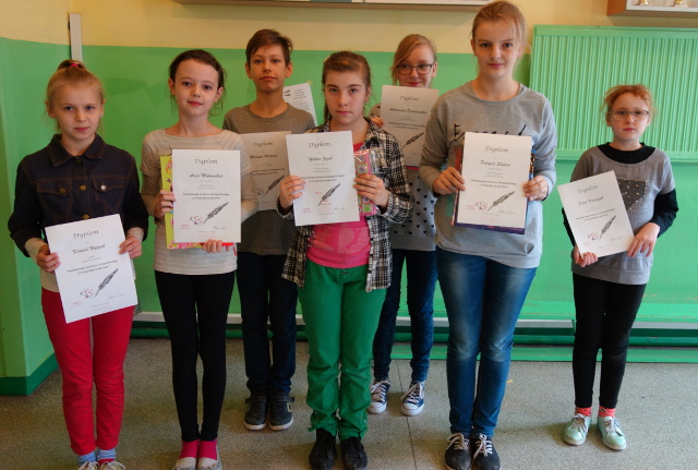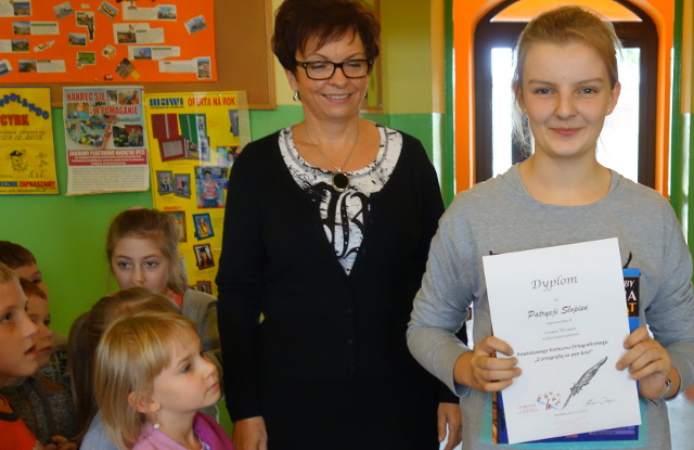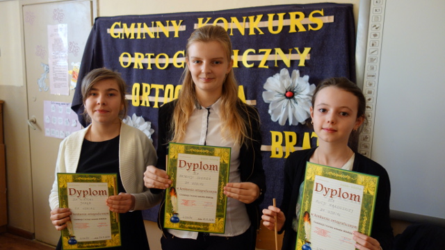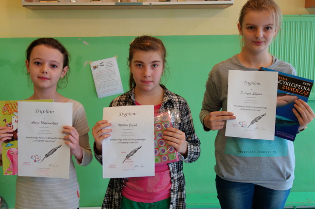 „Z ortografią za pan brat” to konkurs powiatowy składający się z trzech etapów. Pierwszy z nich to etap szkolny, który został przeprowadzony13 listopada. W szranki z ortografią stanęło 7 naszych uczniów z kl.V i VI. Zmagania pozwoliły wyłonić najlepszą trójkę, która reprezentowała naszą szkołę w kolejnym etapie konkursu na szczeblu gminnym. Były to: Wiktoria Jażąb z kl.VI, Alicja Mąkowska z kl.V i Patrycja Słopień z kl.VI.
