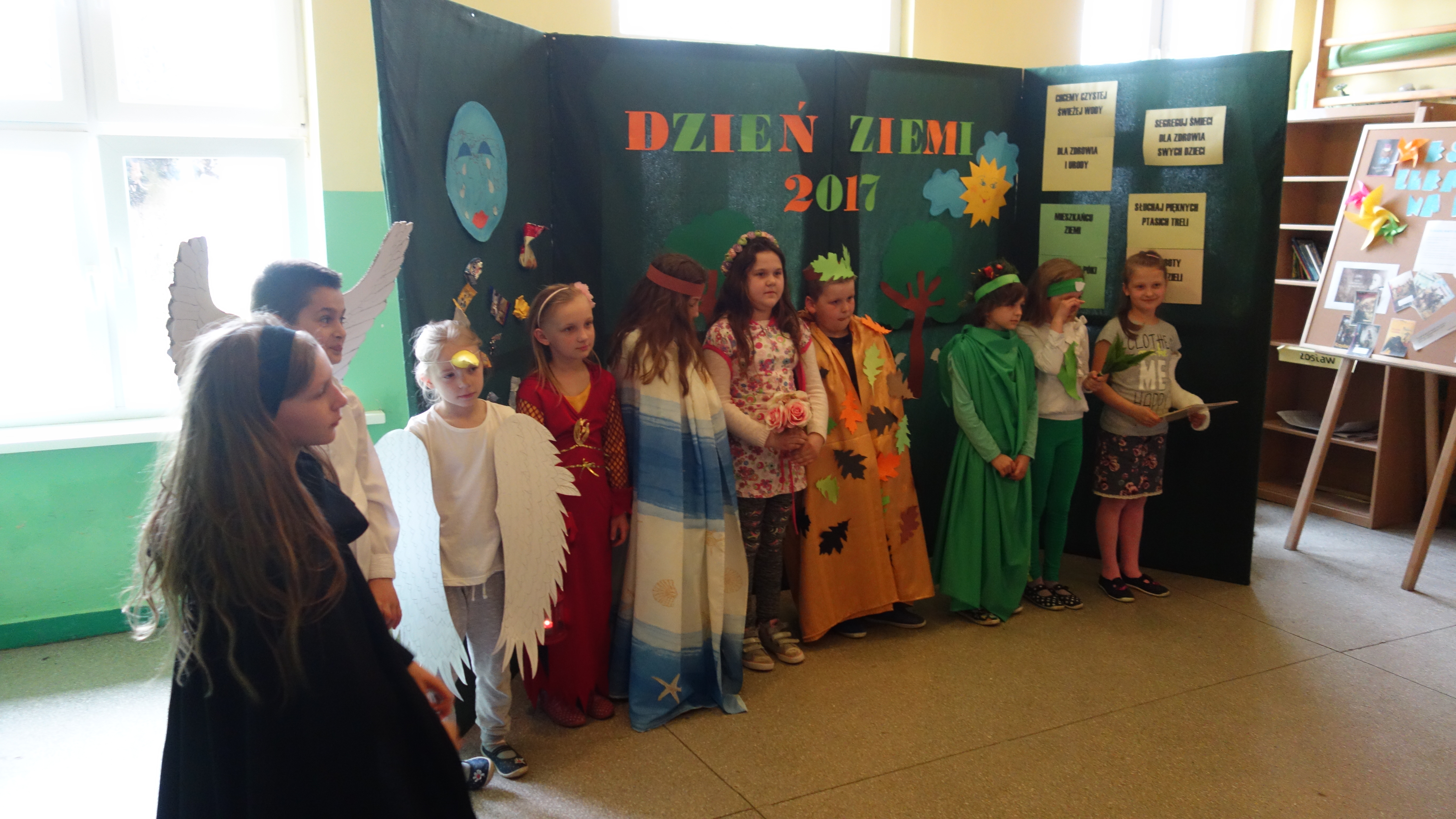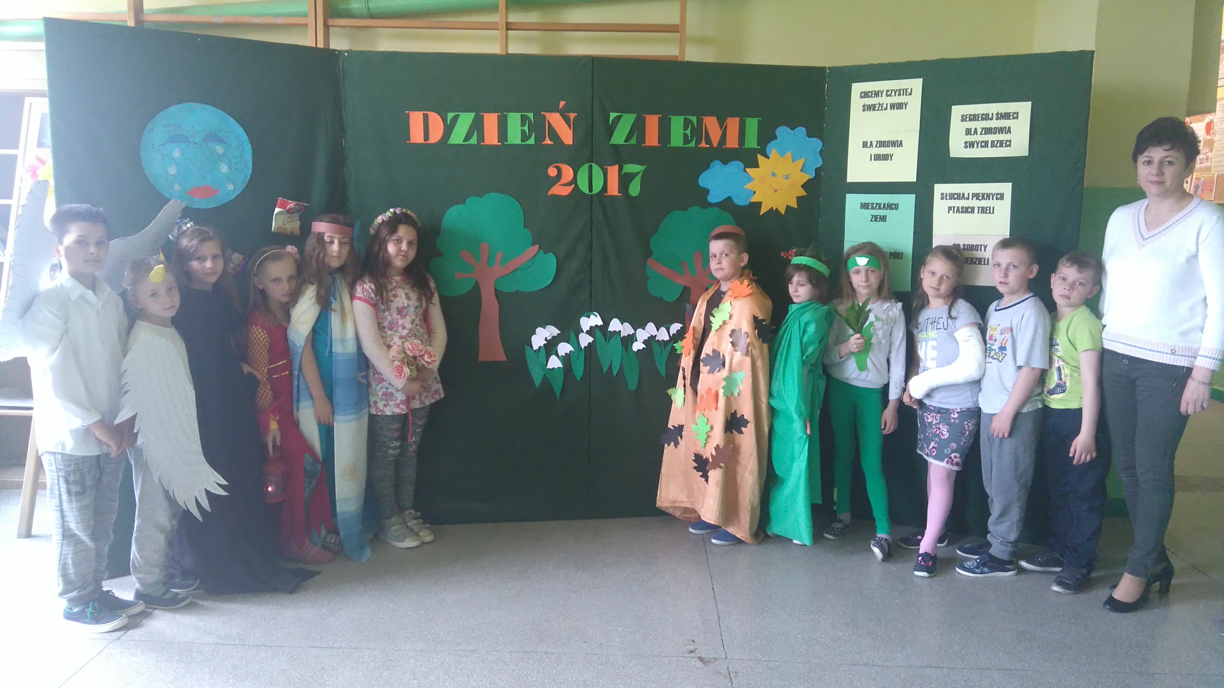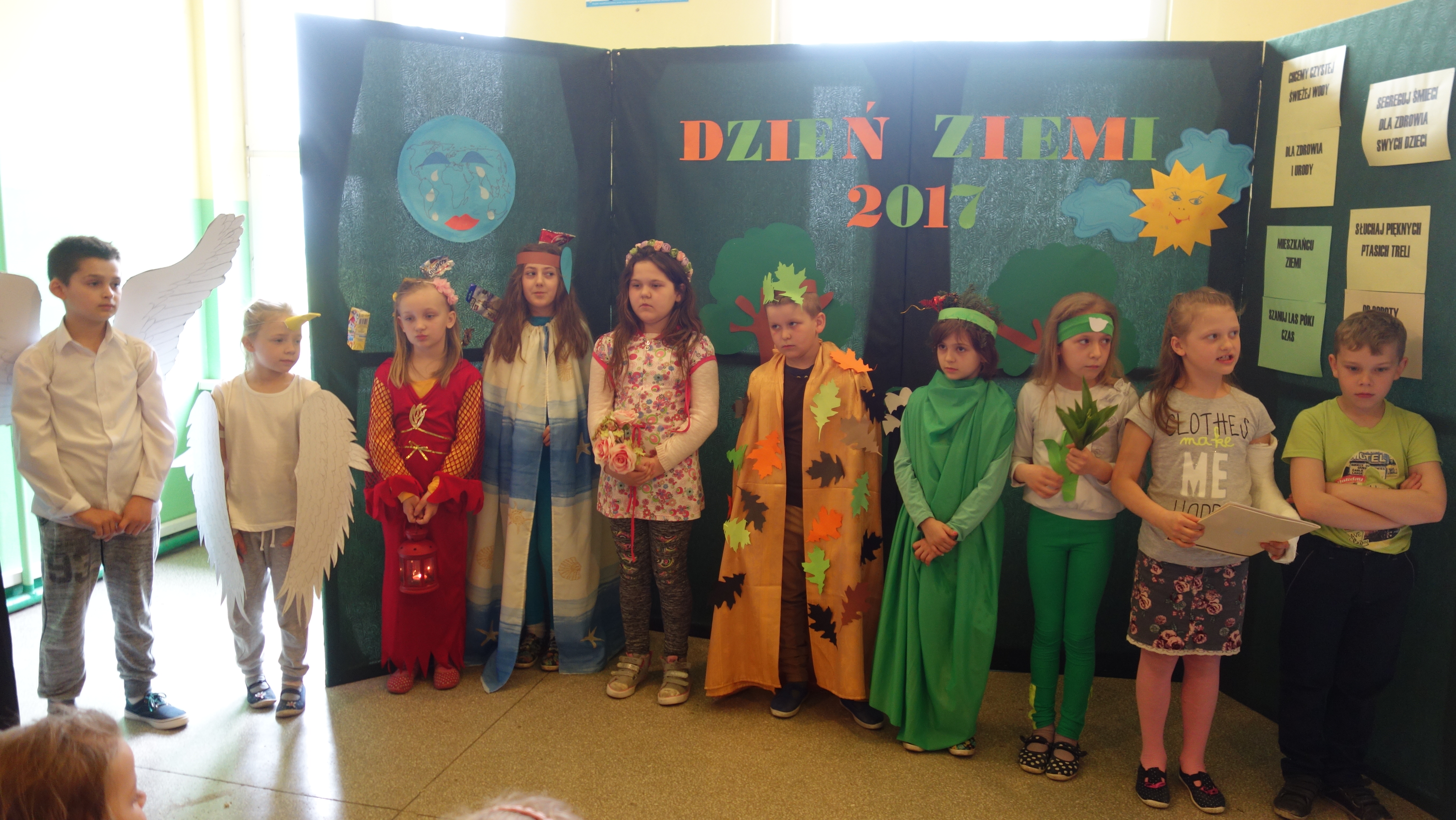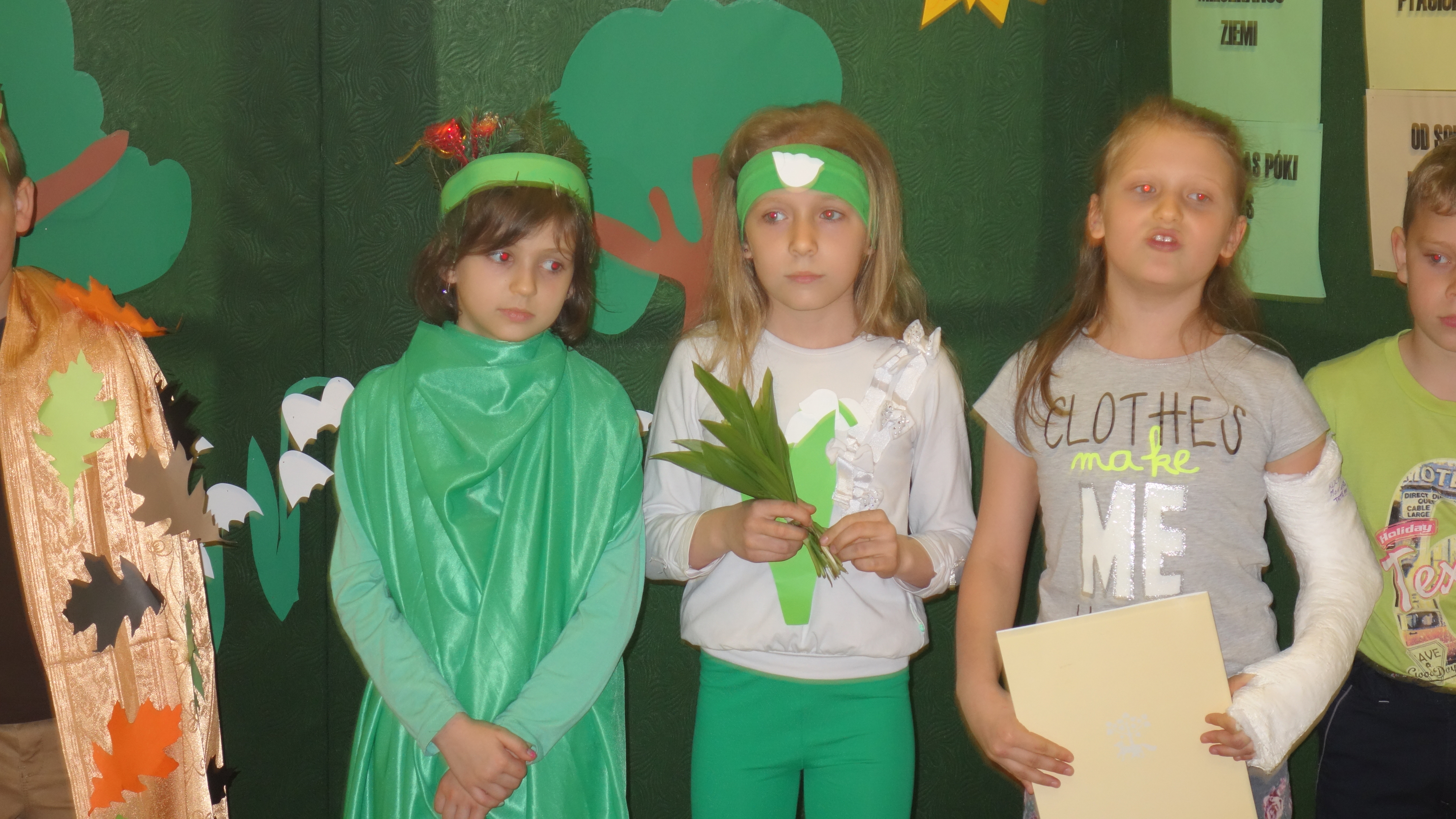 Zgodnie z tradycją obchodziliśmy w naszej szkole Dzień Ziemi. Z tej okazji członkowie Kółka Małego Ekologa z kl. II wraz z panią Anną Mąkowską przygotowali przedstawienie pt. ,,Na ratunek Ziemi!’’. Cenne rady zawarte w przedstawieniu przypominały nam, że o otaczającą nas przyrodę trzeba nieustannie dbać, a smog, który coraz częściej się pojawia to nieprzyjaciel istot zamieszkujących naszą planetę. Piękne i kolorowe stroje dzieci uświadomiły jak cenny i bogaty jest świat flory i fauny. Trzeba pamiętać, że środowisko naturalne Ziemi należy chronić. W jaki sposób możemy to zrobić? Sadźmy drzewa w miejsce wyciętych, segregujmy odpady (pod żadnym pozorem nie wolno spalać tworzyw sztucznych w przydomowym piecu, jest to jedną z przyczyn występowania smogu), oszczędzajmy wodę