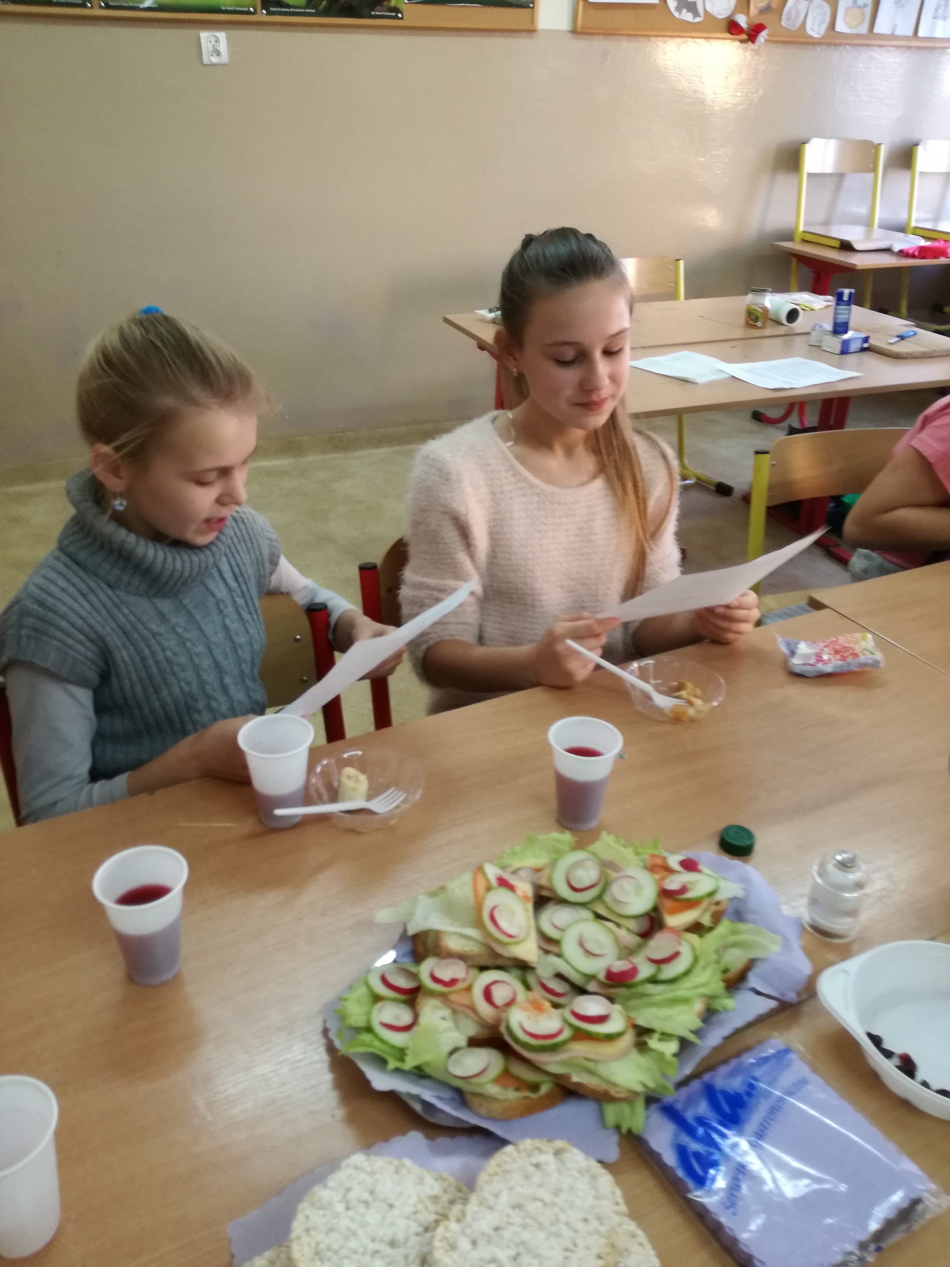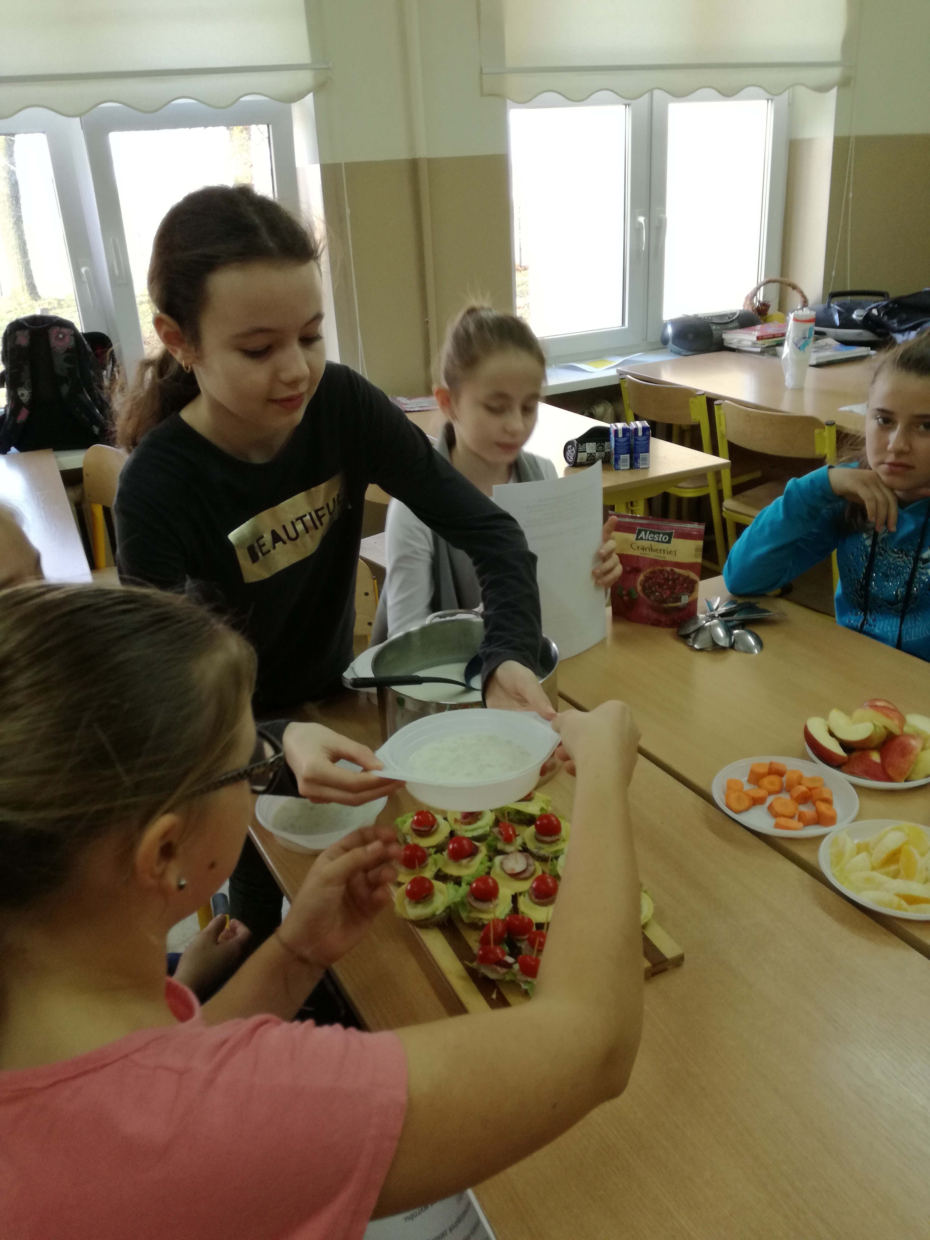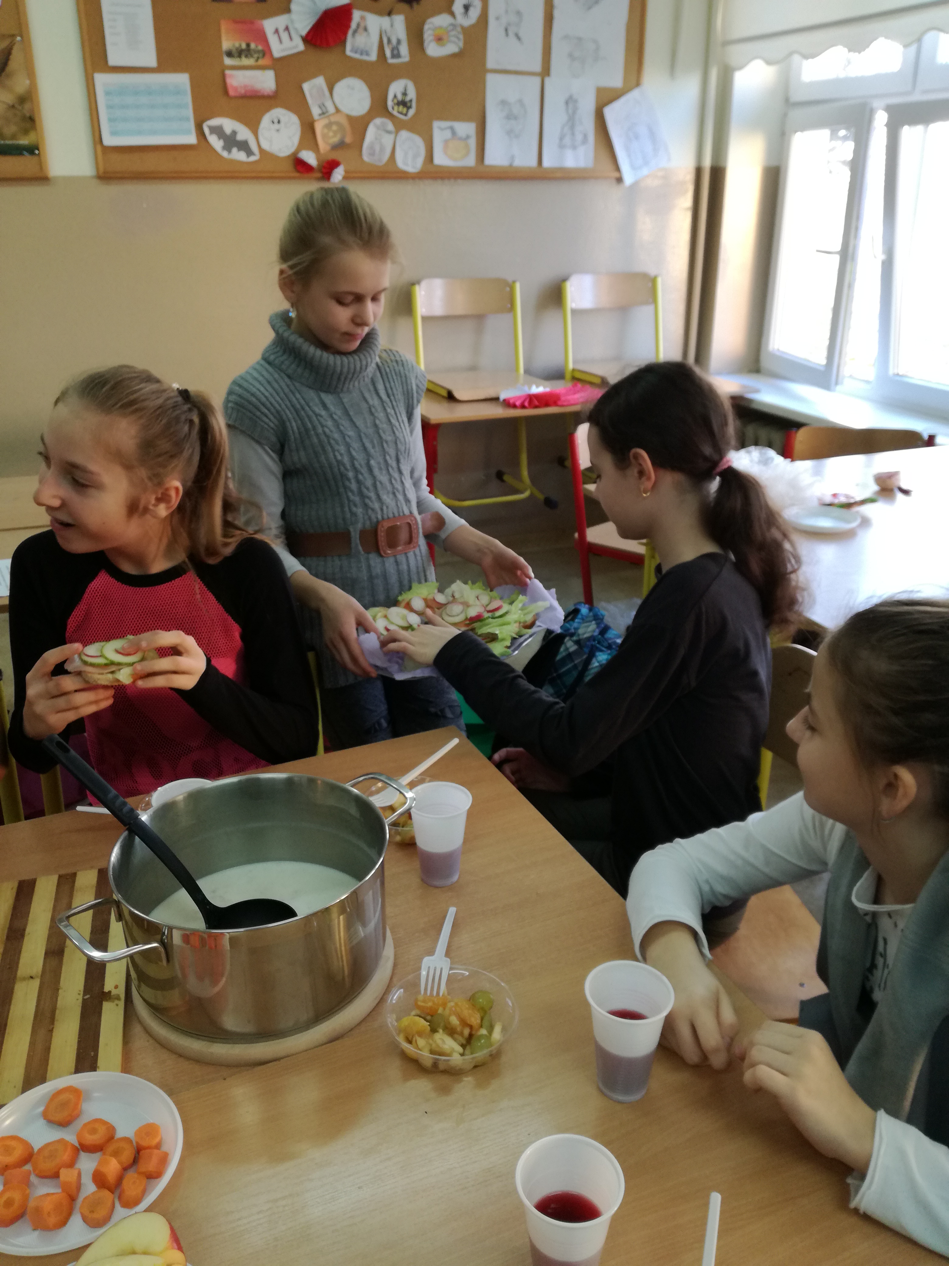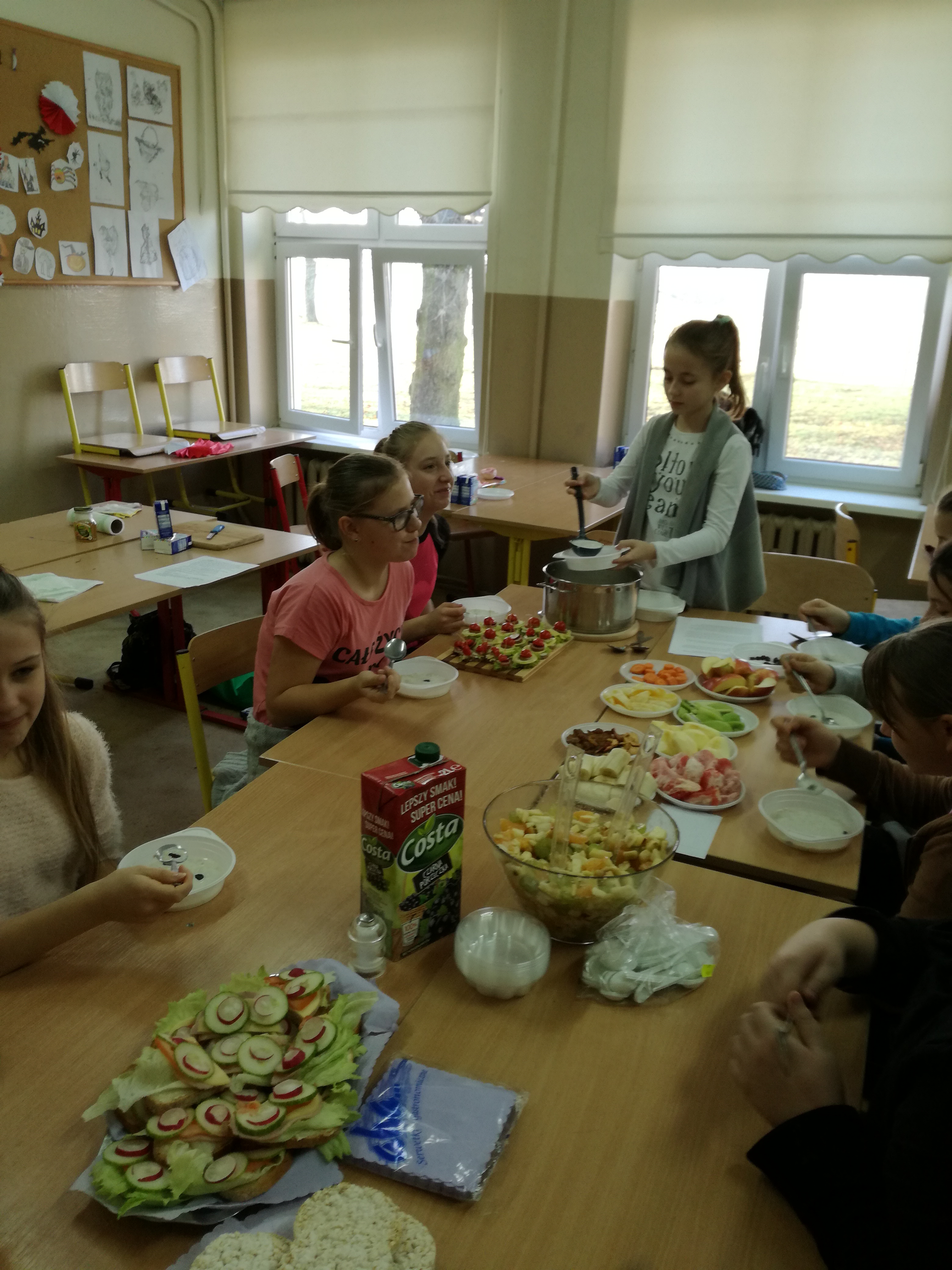 Uczniowie klasy VI na lekcji wychowawczej przygotowali zdrowe śniadanie i zdrowe przekąski dla swoich koleżanek i kolegów. Zanim doszło do degustacji najpierw uczniowie przygotowali się do działania poprzez studiowanie odpowiednich poradników, stron www itp. zawierających informacje o zdrowym posiłku, z czego powinien się składać, co zawierać. Następnie z przyniesionych składników na zajęciach przygotowali samodzielnie kanapki, sałatkę, przekąski i owsiankę. Degustację poprzedziła krótka prelekcja na temat przygotowanego dania. Niektórzy po raz pierwszy jedli owsiankę, a to taki zdrowy posiłek zawierający dużo błonnika, białka, witamin i minerałów oraz cenne kwasy tłuszczowe.