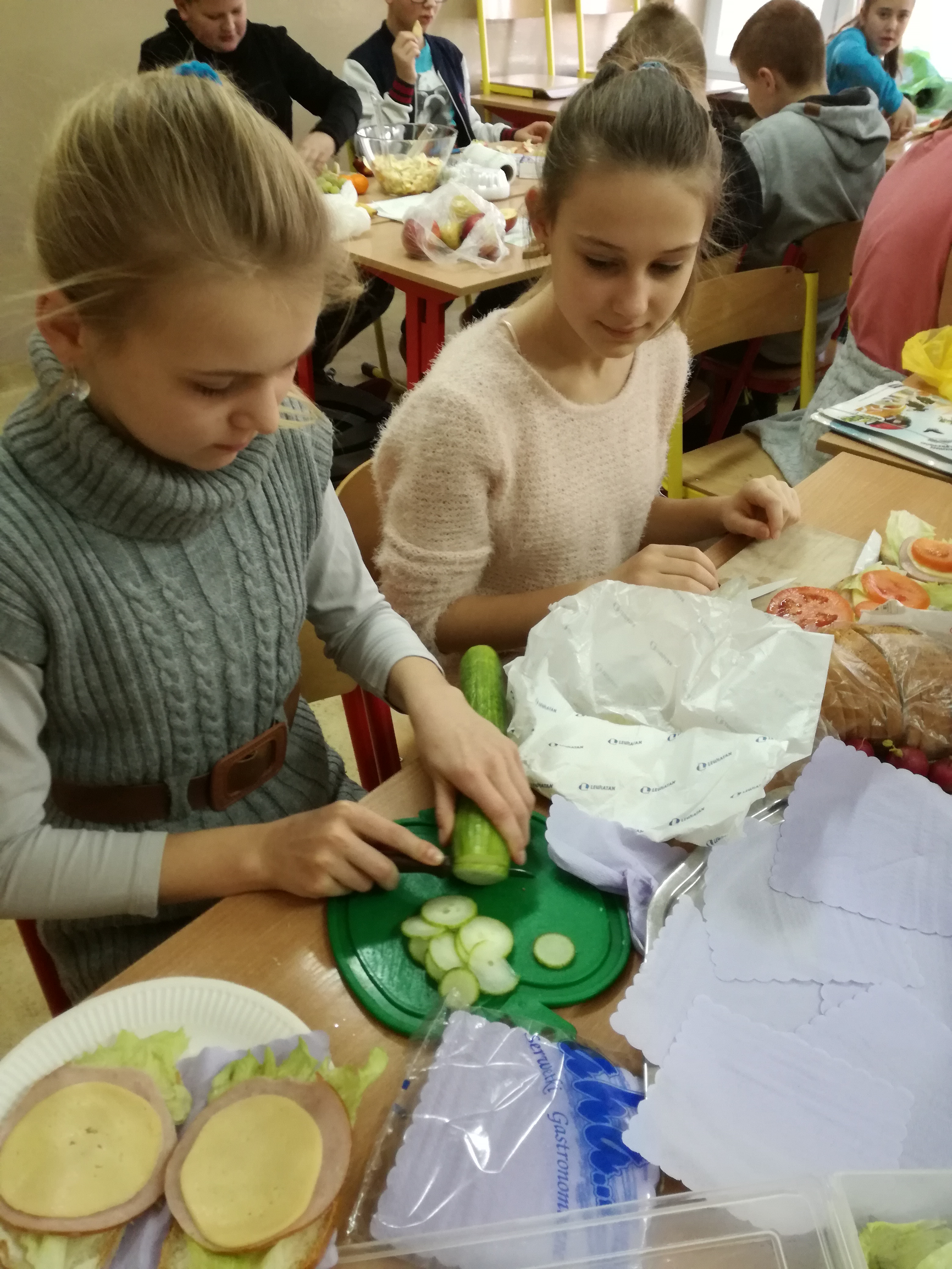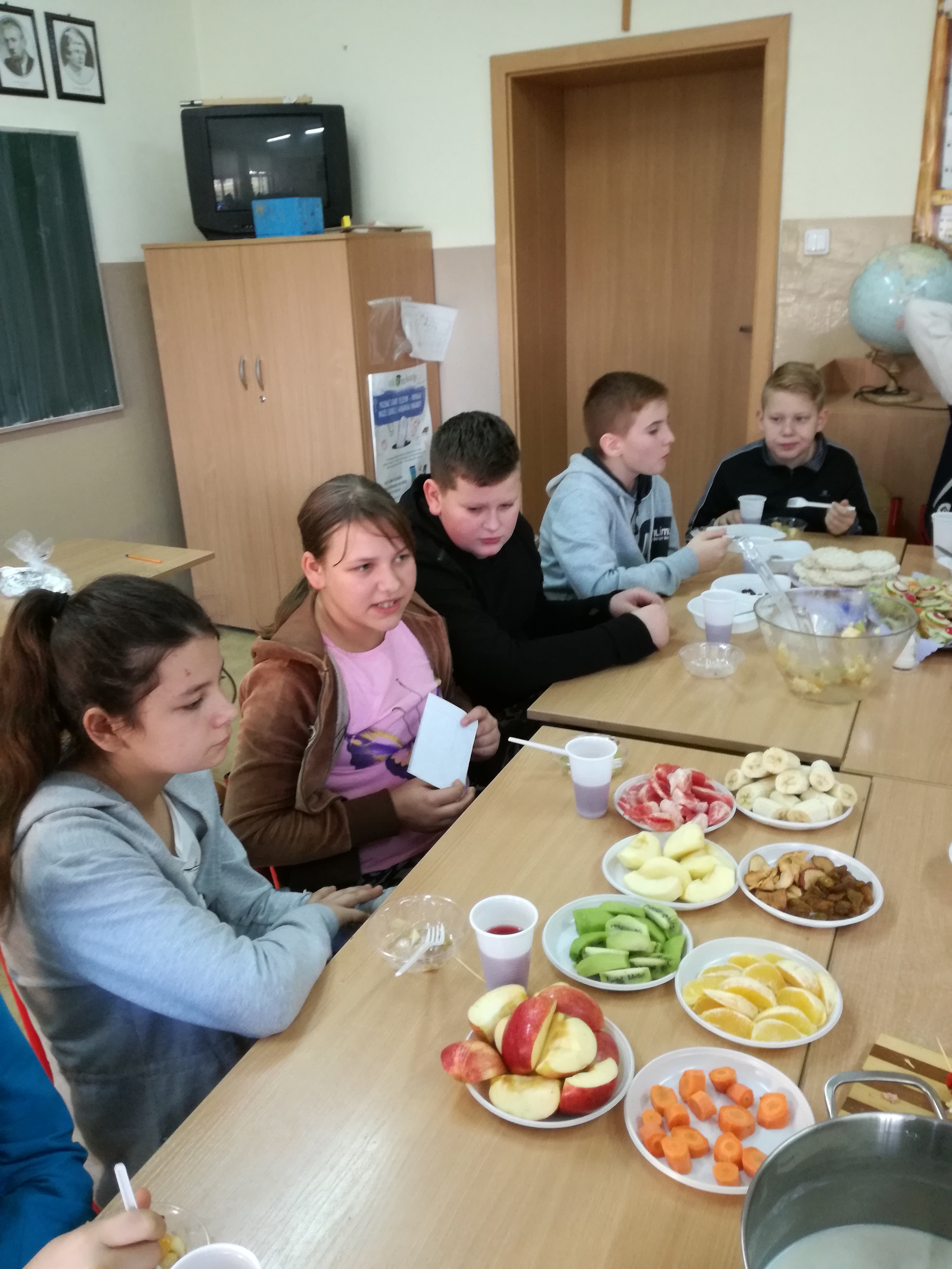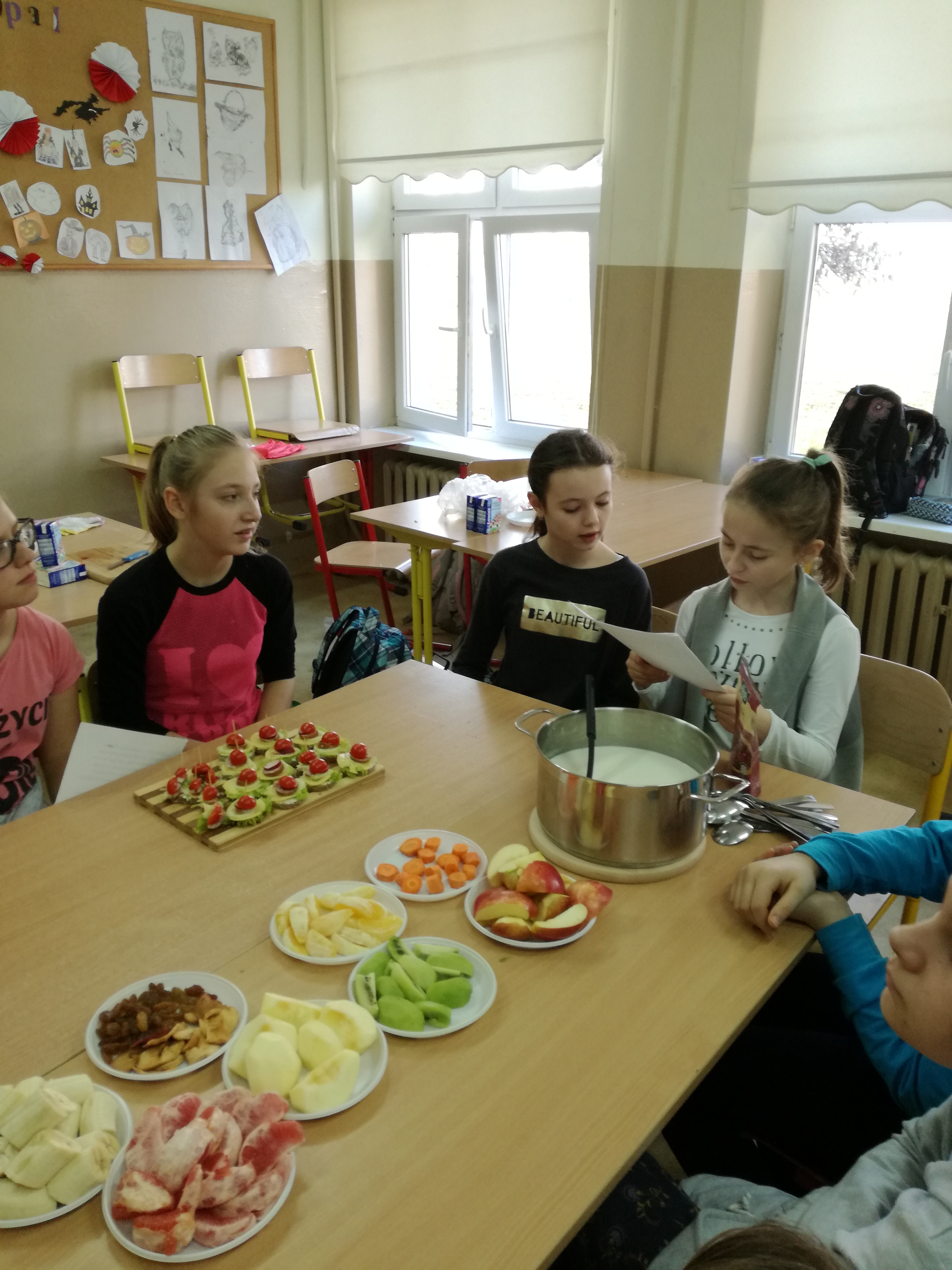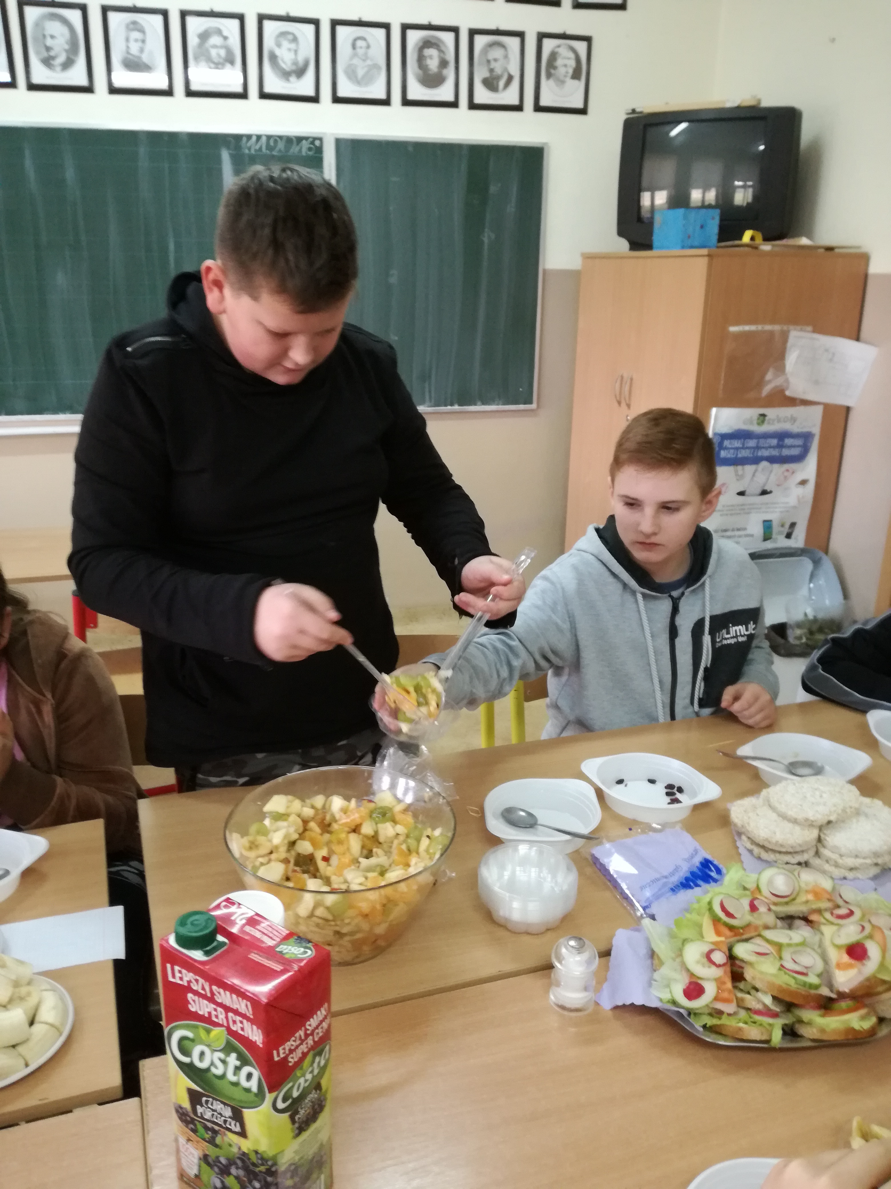 Uczniowie klasy VI na lekcji wychowawczej przygotowali zdrowe śniadanie i zdrowe przekąski dla swoich koleżanek i kolegów. Zanim doszło do degustacji najpierw uczniowie przygotowali się do działania poprzez studiowanie odpowiednich poradników, stron www itp. zawierających informacje o zdrowym posiłku, z czego powinien się składać, co zawierać. Następnie z przyniesionych składników na zajęciach przygotowali samodzielnie kanapki, sałatkę, przekąski i owsiankę. Degustację poprzedziła krótka prelekcja na temat przygotowanego dania. Niektórzy po raz pierwszy jedli owsiankę, a to taki zdrowy posiłek zawierający dużo błonnika, białka, witamin i minerałów oraz cenne kwasy tłuszczowe.
