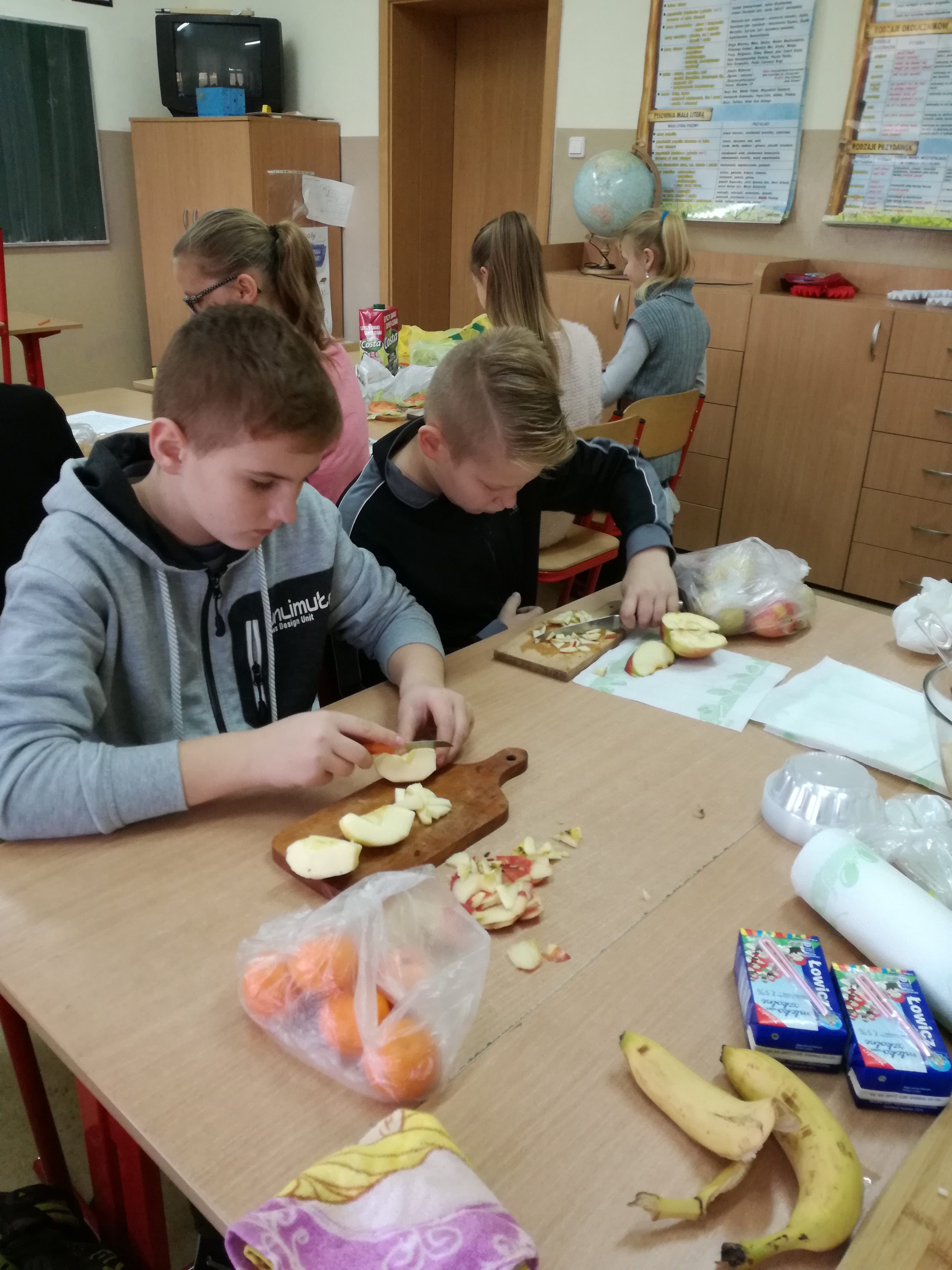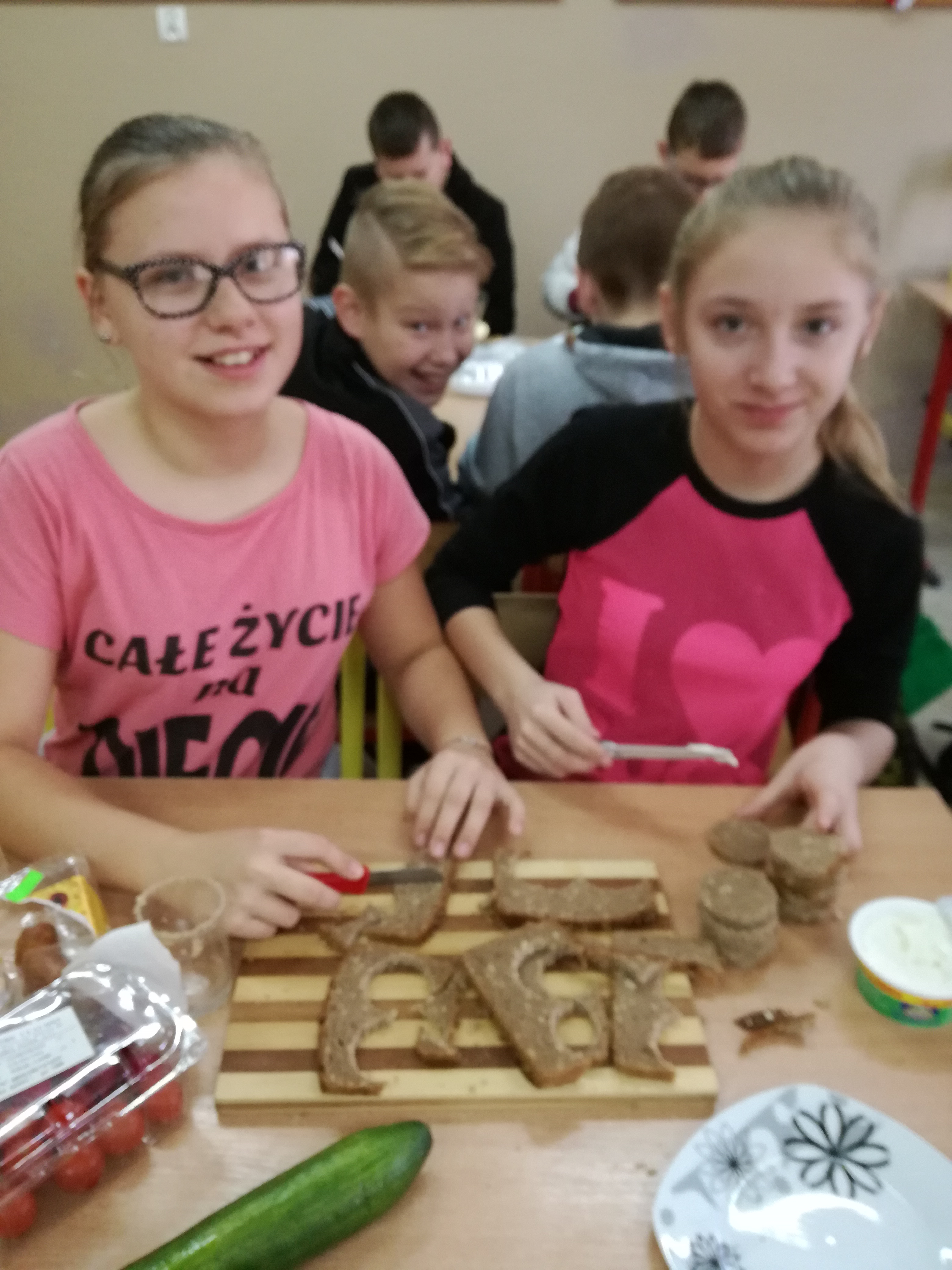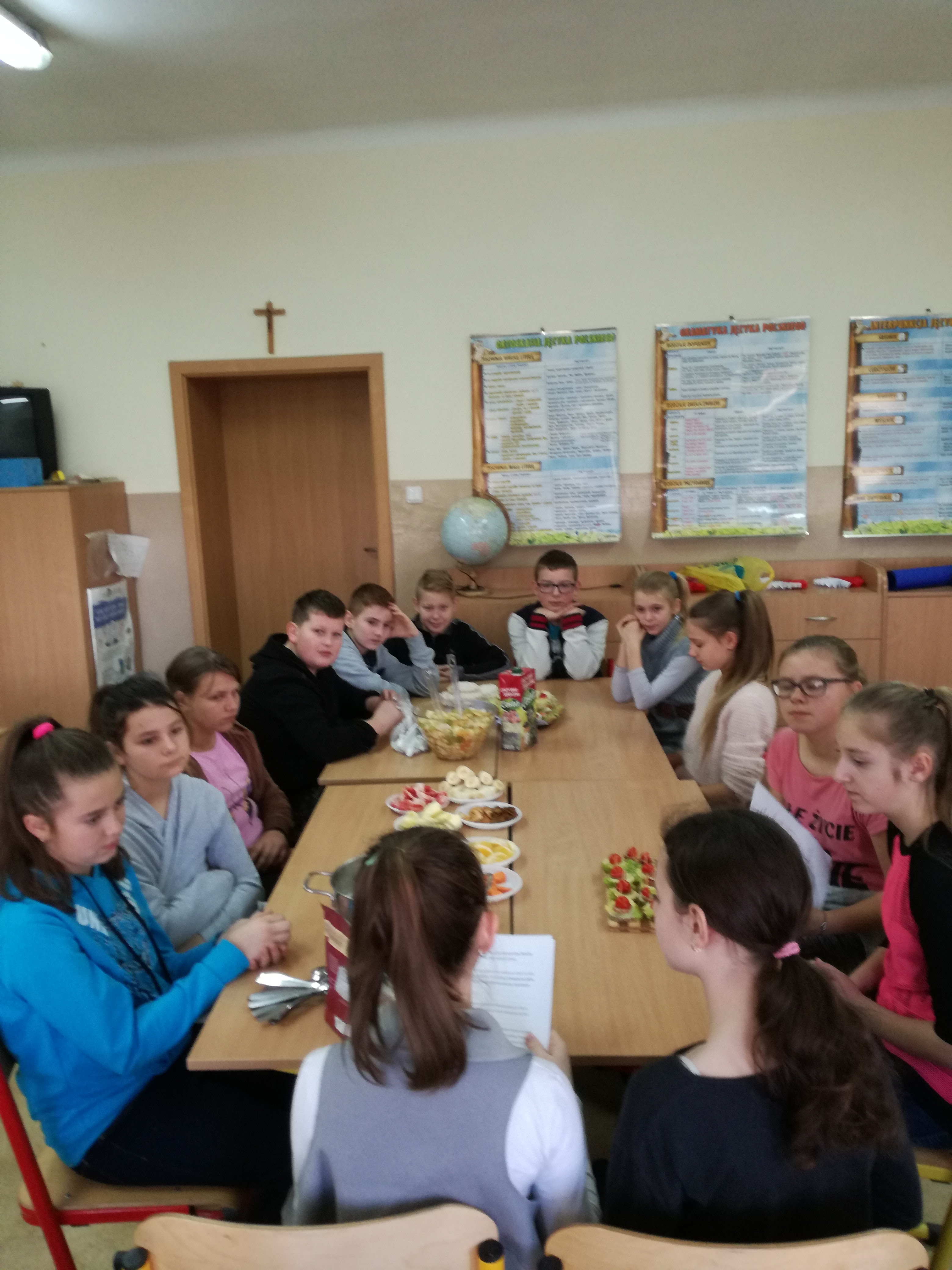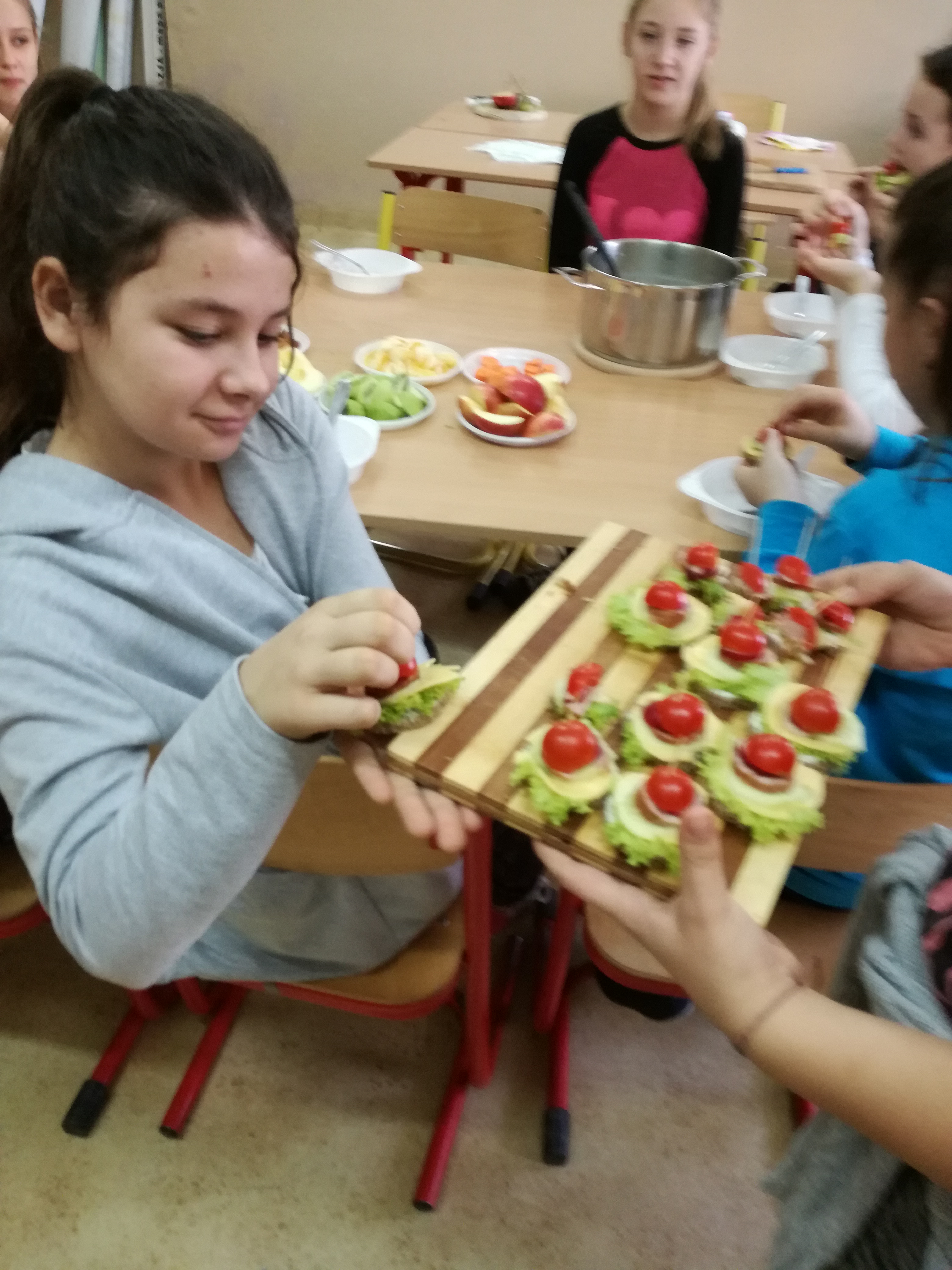 Uczniowie klasy VI na lekcji wychowawczej przygotowali zdrowe śniadanie i zdrowe przekąski dla swoich koleżanek i kolegów. Zanim doszło do degustacji najpierw uczniowie przygotowali się do działania poprzez studiowanie odpowiednich poradników, stron www itp. zawierających informacje o zdrowym posiłku, z czego powinien się składać, co zawierać. Następnie z przyniesionych składników na zajęciach przygotowali samodzielnie kanapki, sałatkę, przekąski i owsiankę. Degustację poprzedziła krótka prelekcja na temat przygotowanego dania. Niektórzy po raz pierwszy jedli owsiankę, a to taki zdrowy posiłek zawierający dużo błonnika, białka, witamin i minerałów oraz cenne kwasy tłuszczowe.