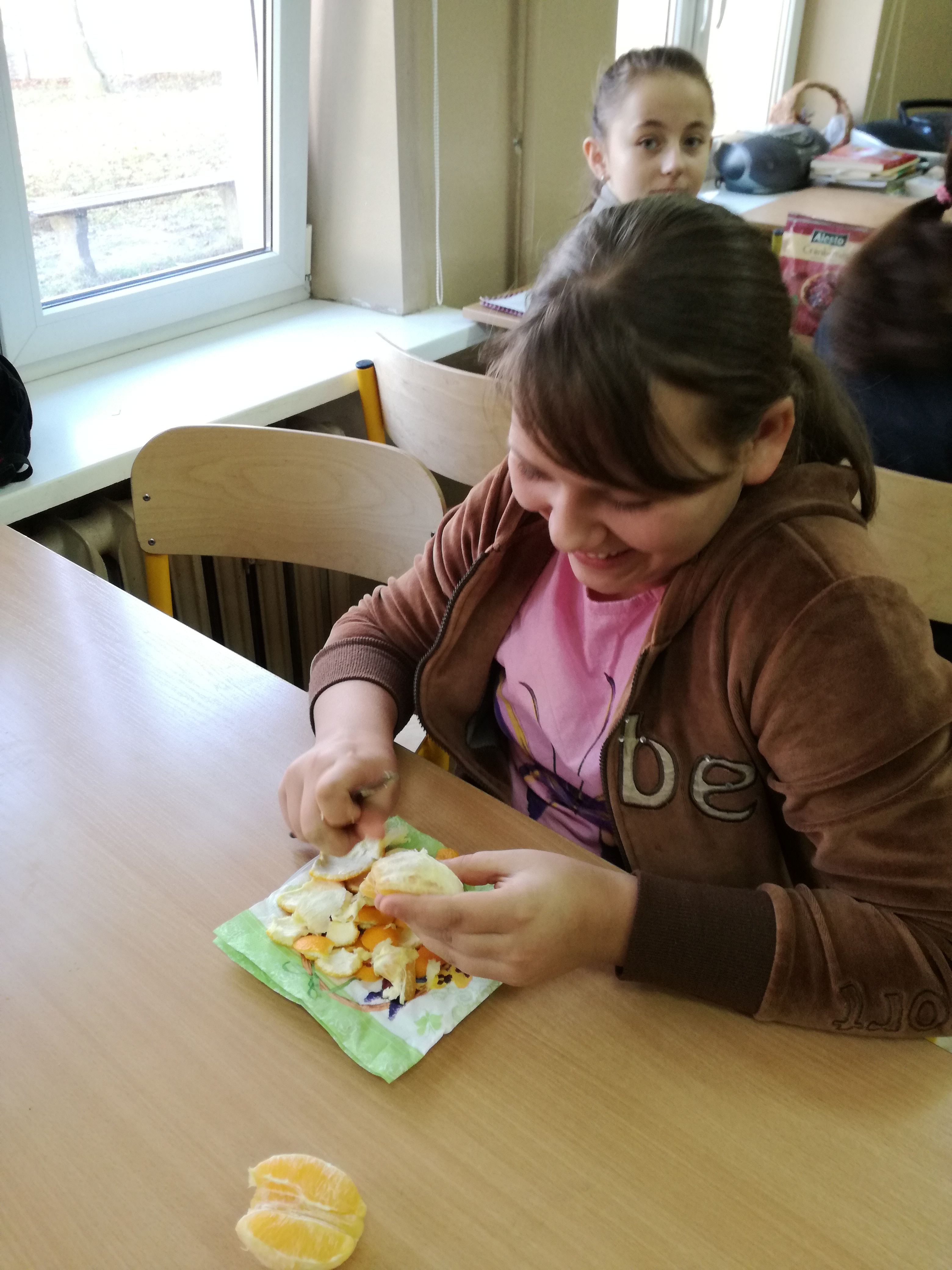 zdrowe przekąski , przygotowane przez Justynę, Natalię i Anię. Były to warzywa i owoce pokrojone w plasterki lub cząstki. Wśród przekąsek znalazły się: marchewka, jabłka, banany, pomarańcze, grejpfrut, kiwi, suszone owoce- jabłka, gruszki, rodzynki;