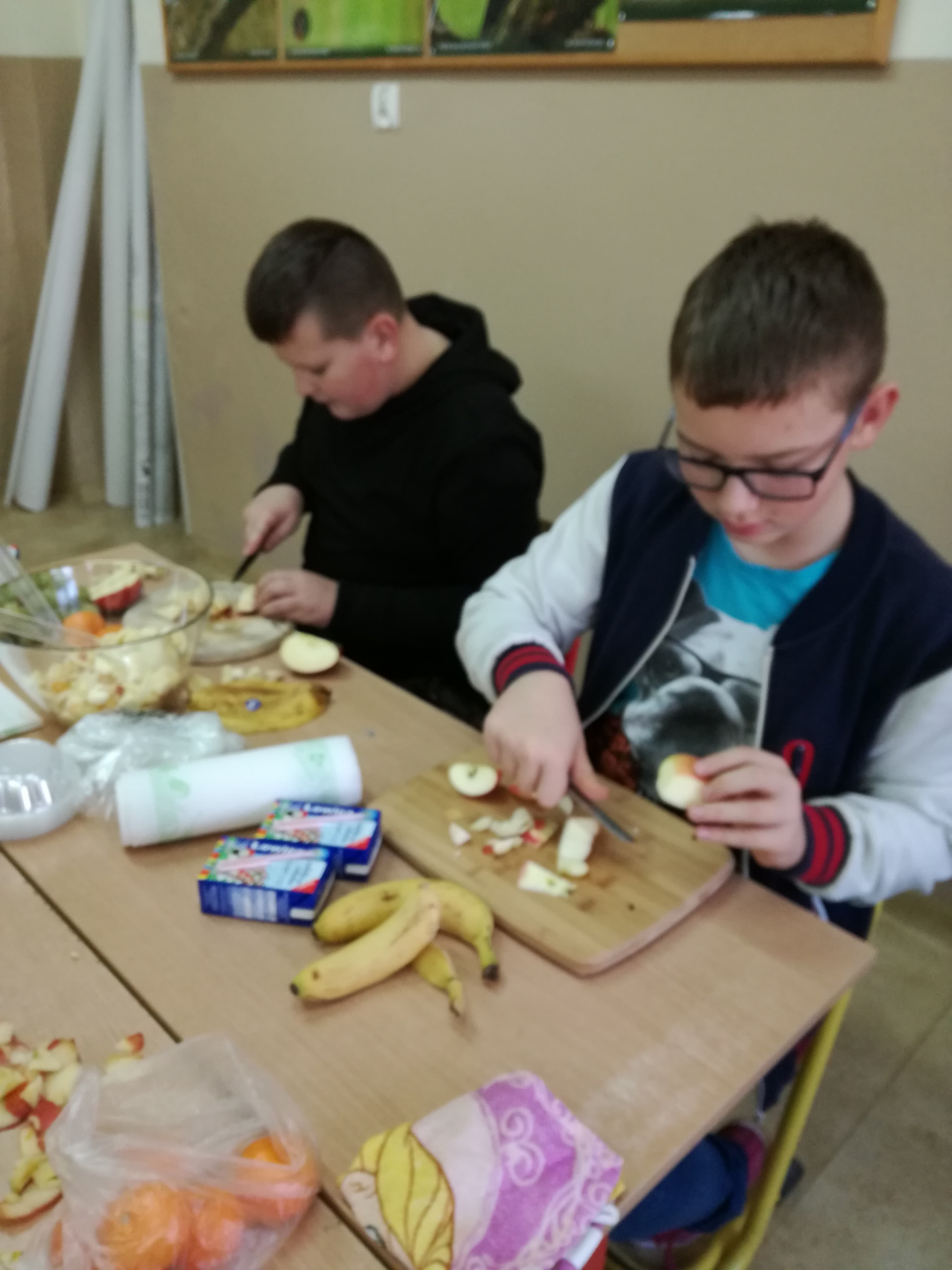 sałatka owocowa przygotowana przez Bartka, Huberta, Wiktora i Dominika, zawierała różne owoce m.in. banany, jabłko, mandarynki, winogrona, miód;