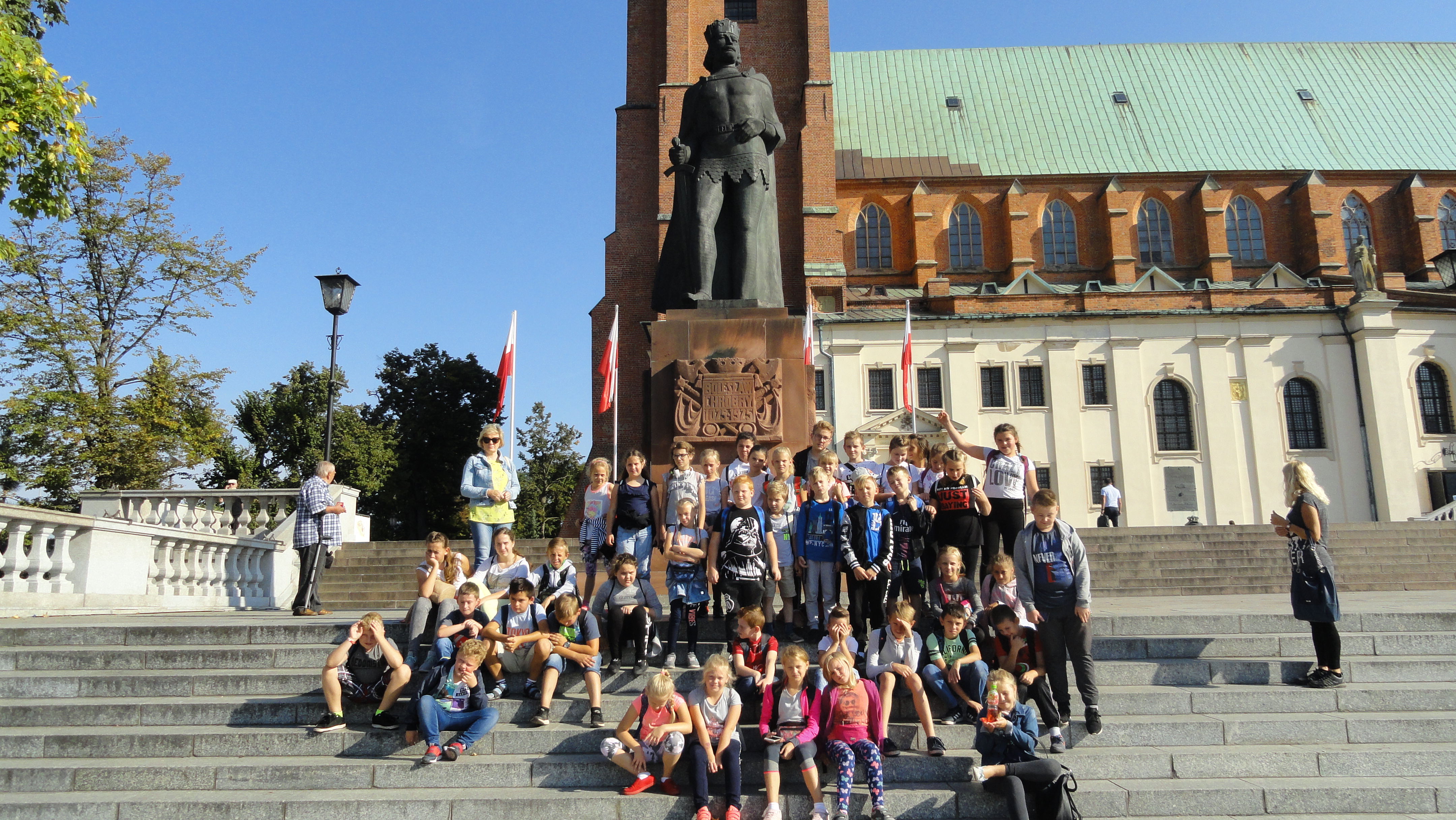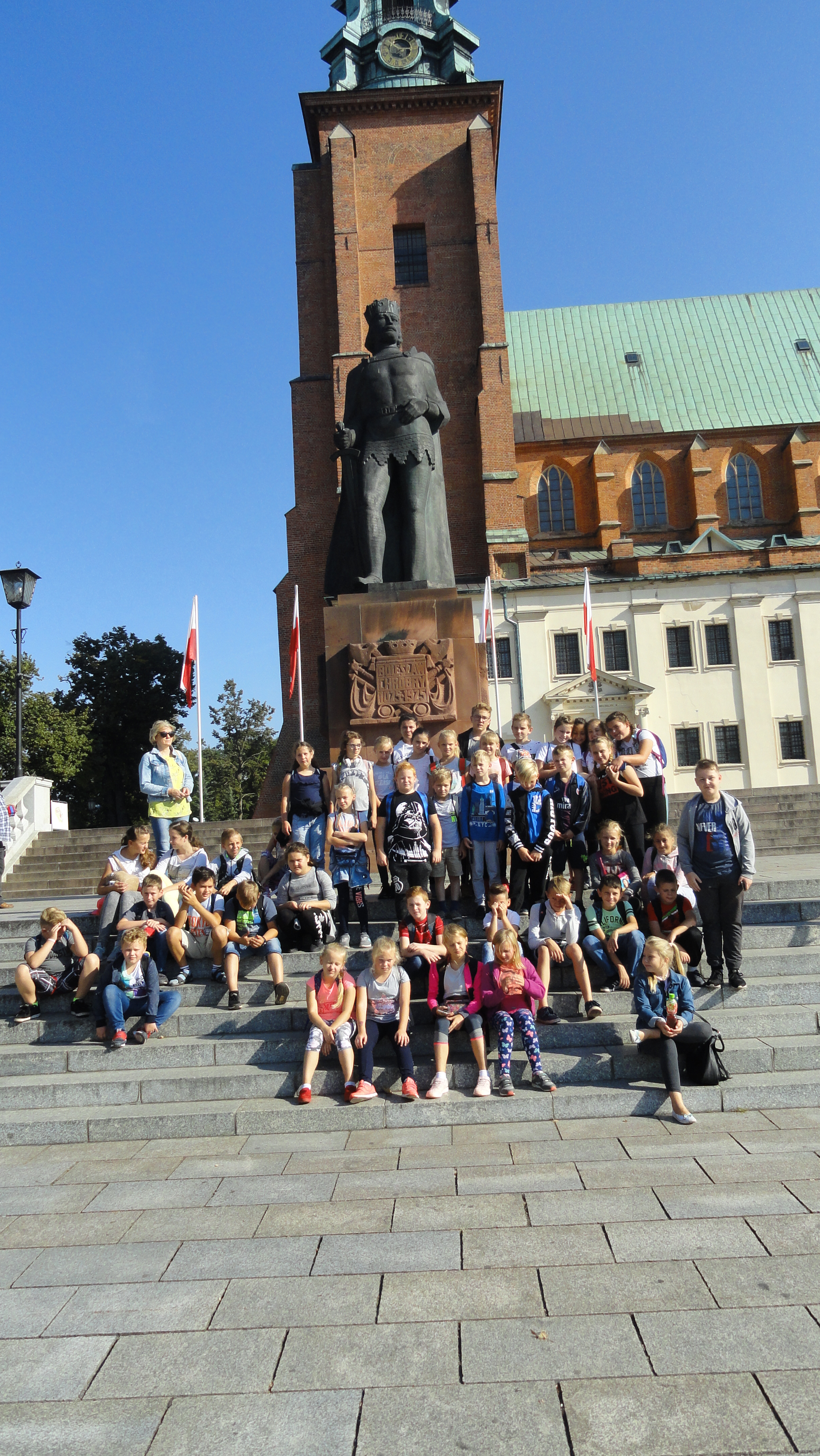 Celem wycieczki było poznanie miejsc i zabytków związanych z początkami państwa polskiego, zainteresowanie i zaciekawienie uczniów historią Polski, zdobywanie wiedzy historycznej przez obserwację i doświadczanie. Najpierw odwiedziliśmy pierwszą stolicę Polski. Zwiedziliśmy Katedrę i zobaczyliśmy Drzwi Gnieźnieńskie, będące unikatowym zabytkiem sztuki romańskiej w Polsce. Potem przeszliśmy do Muzeum Początków Państwa Polskiego. Obejrzeliśmy wystawę „Początki państwa polskiego” poświęconych historii polskiego średniowiecza. Główną ideą wystawy było pokazanie roli Wielkopolski jako kolebki polskiej państwowości, ze szczególnym wyróżnieniem Gniezna, a także ukazanie akcesji państwa piastowskiego do kręgu cywilizacji łacińskiej i chrześcijaństwa. Na wystawie, składającej się z ponad 500 eksponatów, zobaczyliśmy m.in. rekonstrukcję drewnianego wału grodu w Gnieźnie z lat 40. X w., detale architektoniczne z XI-wiecznej katedry gnieźnieńskiej, zabytki archeologiczne dotyczące wierzeń i życia codziennego w czasach pierwszych Piastów pochodzące z Gniezna i okolic, regalia królewskie, księgi, dokumenty, pieczęcie i bulle, elementy wyposażenia średniowiecznych wojów, insygnia władzy biskupiej. Uzupełnieniem wystawy była przedstawiona na osi czasu genealogia dynastii Piastów i znaczących faktów z historii okresu ich panowania.